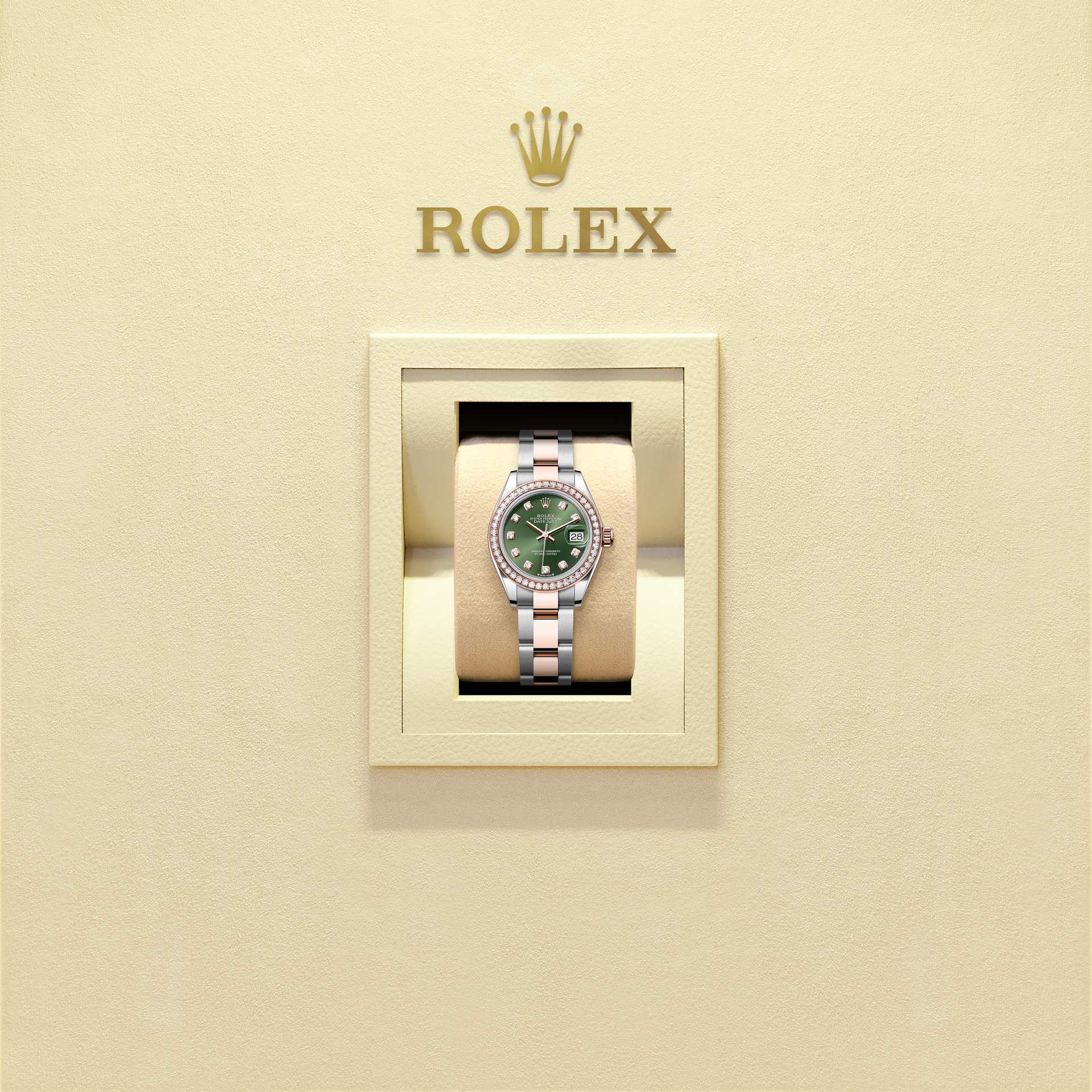Oyster Perpetual Lady-Datejust in acciaio Oystersteel e oro Everose con quadrante verde oliva con diamanti e bracciale Oyster.