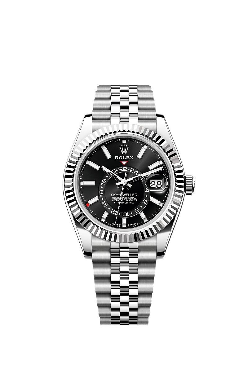 Oyster Perpetual Sky-Dweller in acciaio Oystersteel e oro bianco con quadrante nero vivo e bracciale Jubilee.