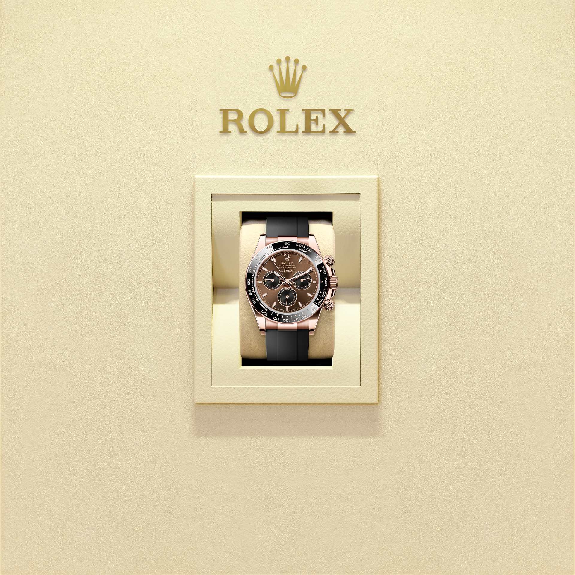 18 ct エバーローズゴールドのオイスター パーペチュアル コスモグラフ デイトナは、チョコレート&ブラックダイアルとオイスターフレックスブレスレットを備え、ブラック セラクロムタキメーターベゼルが特徴的である。