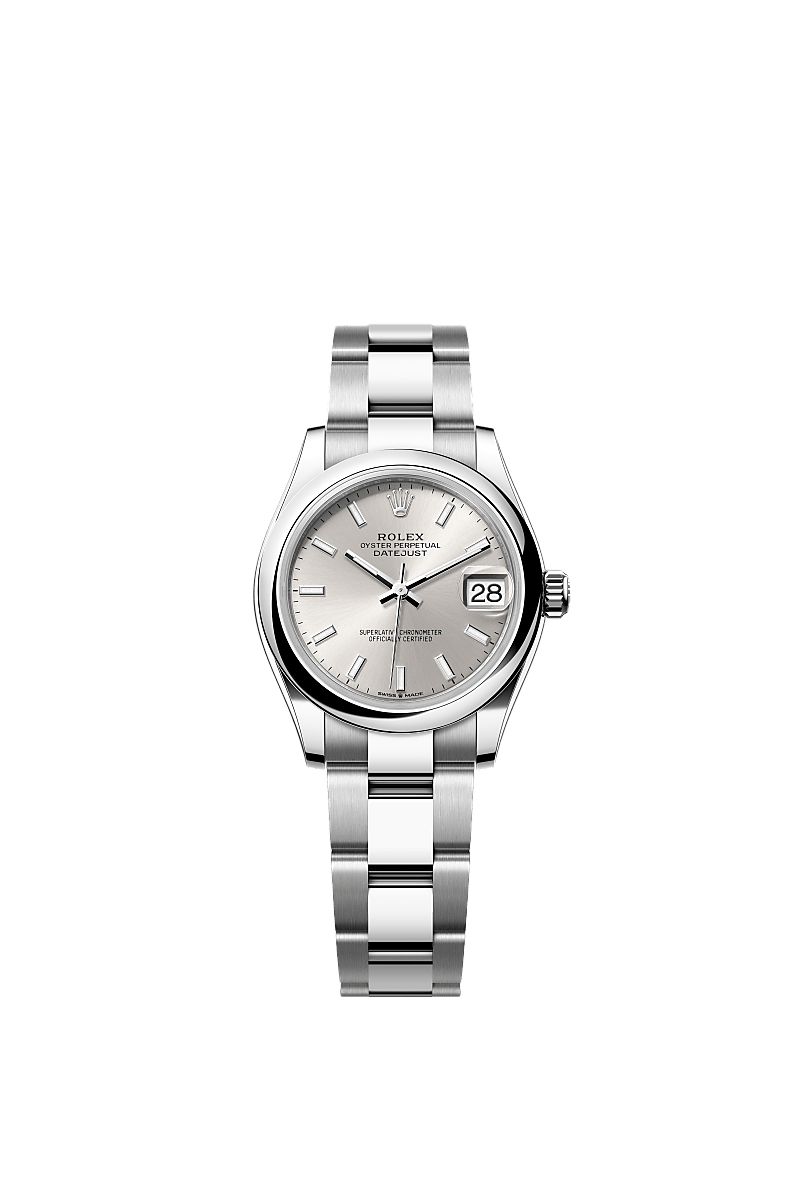 オイスタースチールのオイスター パーペチュアル デイトジャスト 31はシルバーダイアルとオイスターブレスレットを備える。