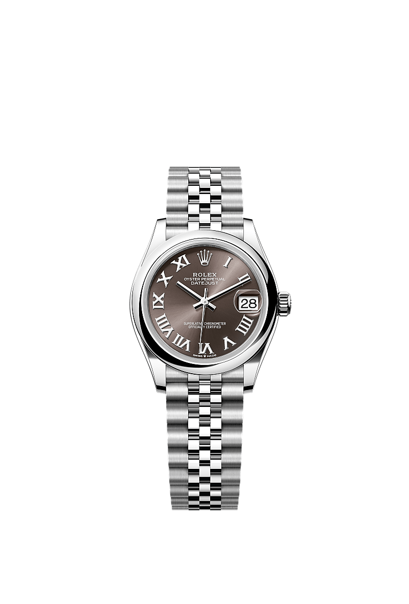 オイスタースチールのオイスター パーペチュアル デイトジャスト 31はダークグレーダイアルとジュビリーブレスレットを備える。