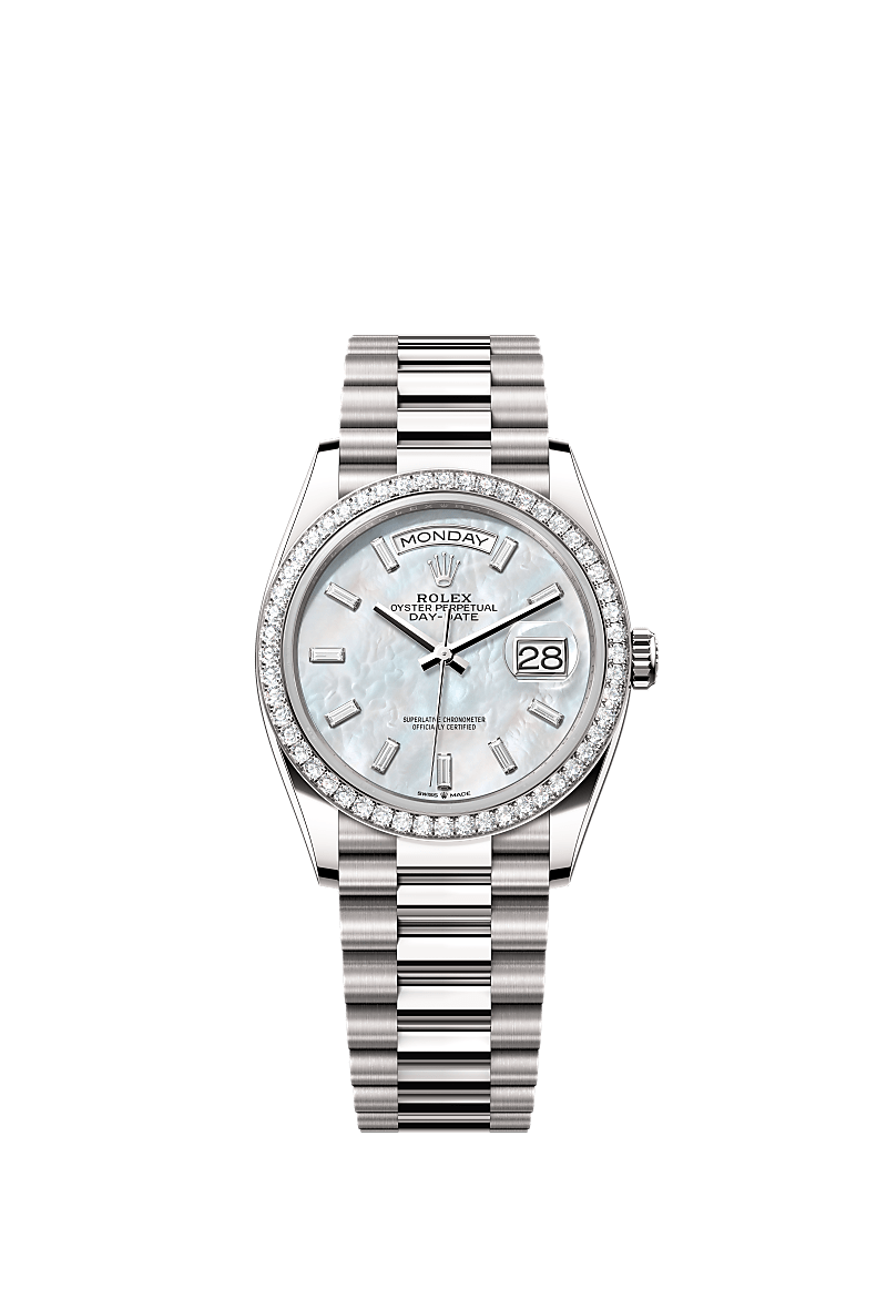 18 ct ホワイトゴールドのオイスター パーペチュアル デイデイト 36は、ホワイトマザーオブパール、ダイヤモンド入りダイアル、ダイヤモンド入りベゼルとプレジデントブレスレットを備える。