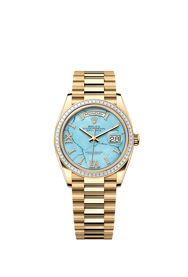 地球上で数カ所にしか存在しないターコイズは、その特別な色合いから何千年も珍重されている。ロレックスがターコイズを選ぶのは、その構造の美しさや特徴、独特なブルーの色がイエローとホワイトゴールドと完璧に調和するからである。ターコイズは、デイデイト 36のゴールドまたはプラチナモデルのみに採用されている。