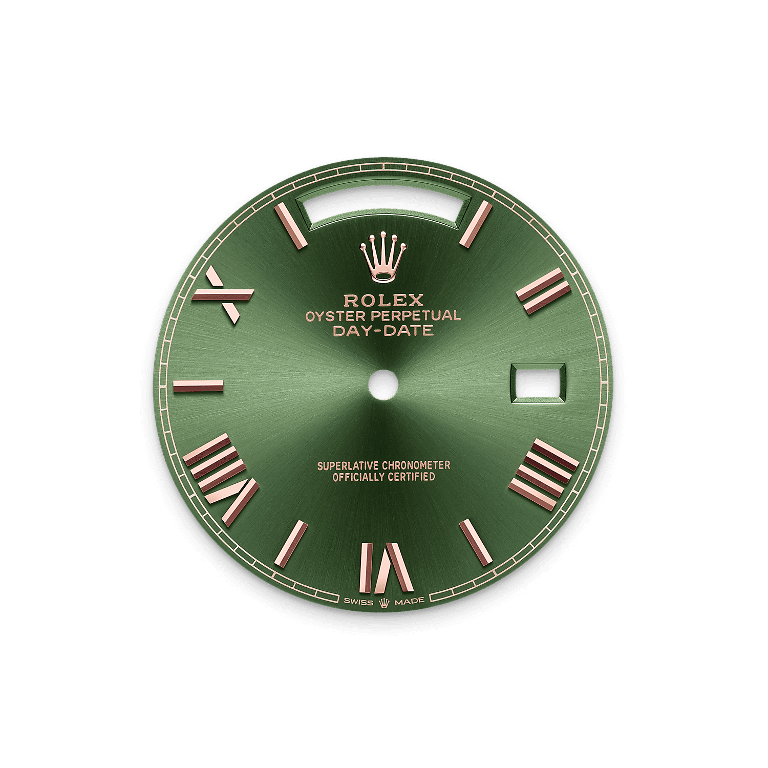 18 ct エバーローズゴールドのオイスター パーペチュアル デイデイト 40は、オリーブグリーンダイアル、フルーテッドベゼルとプレジデントブレスレットを備える。