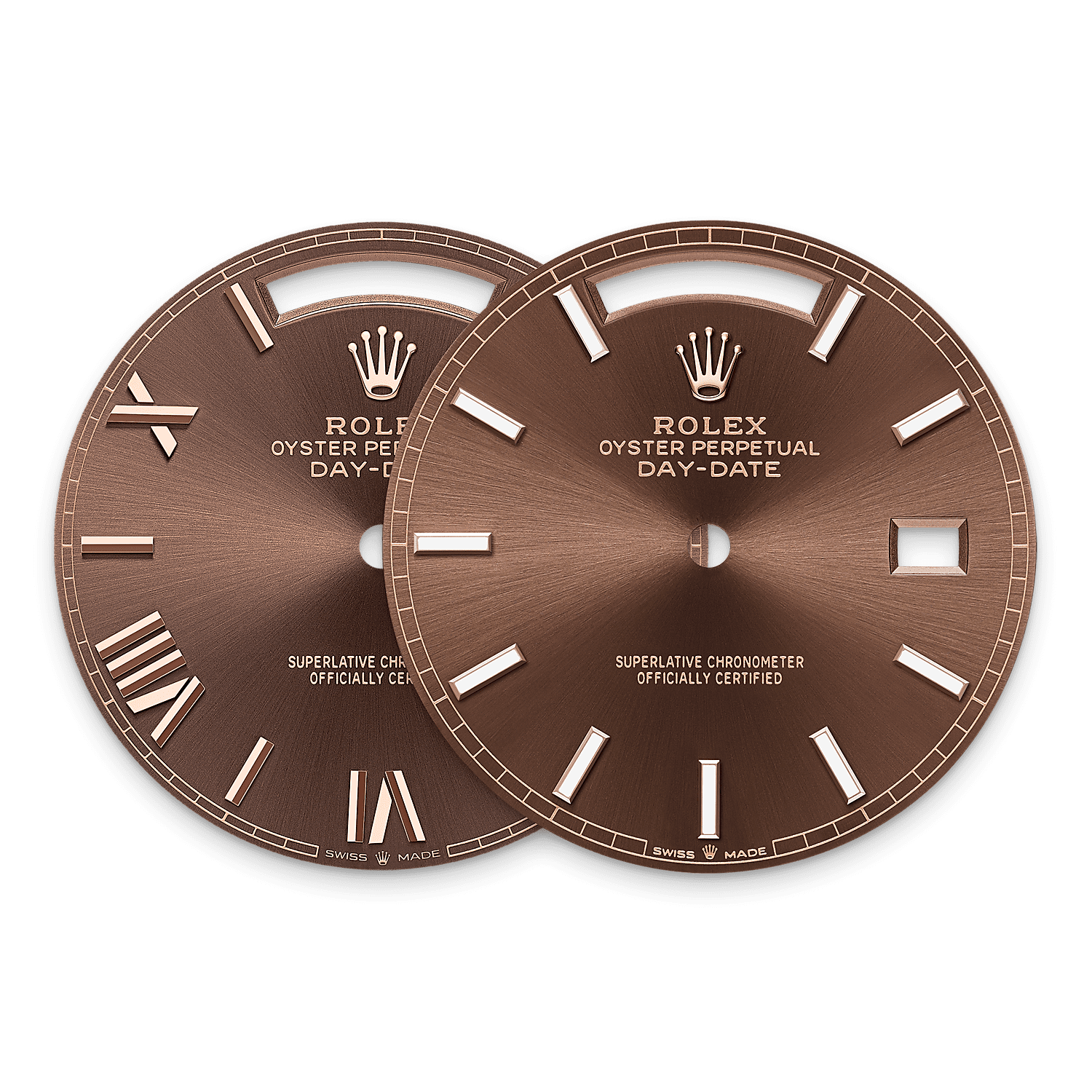 これまで、ロレックスのオンブレダイアルにはダイヤモンドのアワーマーカーがセットされ、デイデイト36にのみ採用されていた。この新しいダイアルは、ロレックスが1980年代に発表し、2019年に再び登場したデザインの流れを受け継いでいる。この同心円状のグラデーションダイアルはブラックラッカーが塗布され、明から暗へのスムーズなグラデーションをつける繊細な作業のため、専門の技術者の監督のもと製造される。