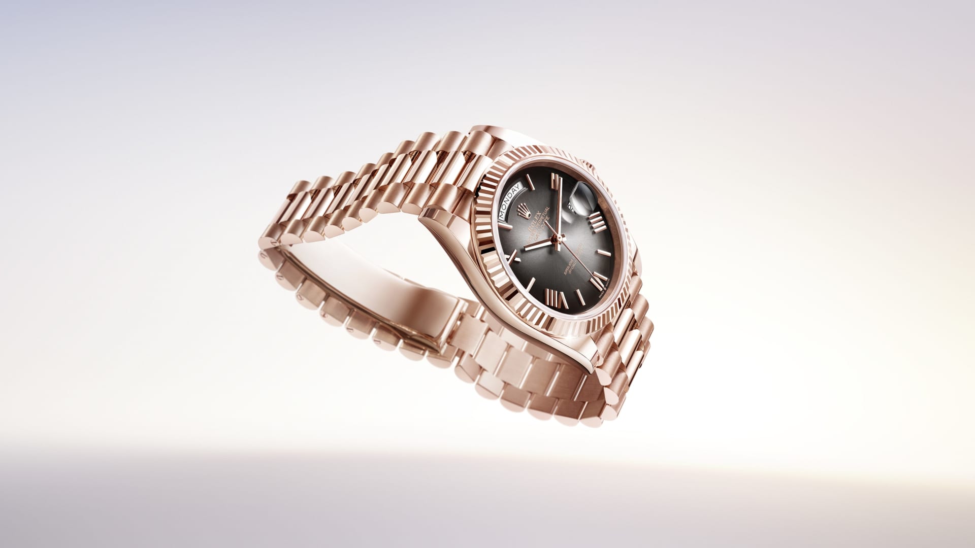18 ct エバーローズゴールドのオイスター パーペチュアル デイデイト 40は、スレートオンブレダイアル、フルーテッドベゼルとプレジデントブレスレットを備える。