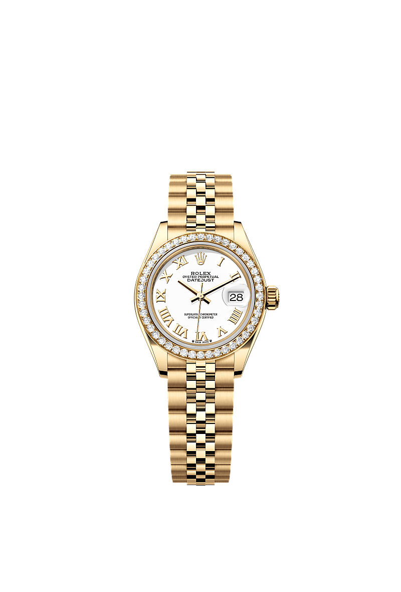 18 ct イエローゴールドのオイスター パーペチュアル レディ デイトジャストはホワイトダイアルとジュビリーブレスレットを備える。
