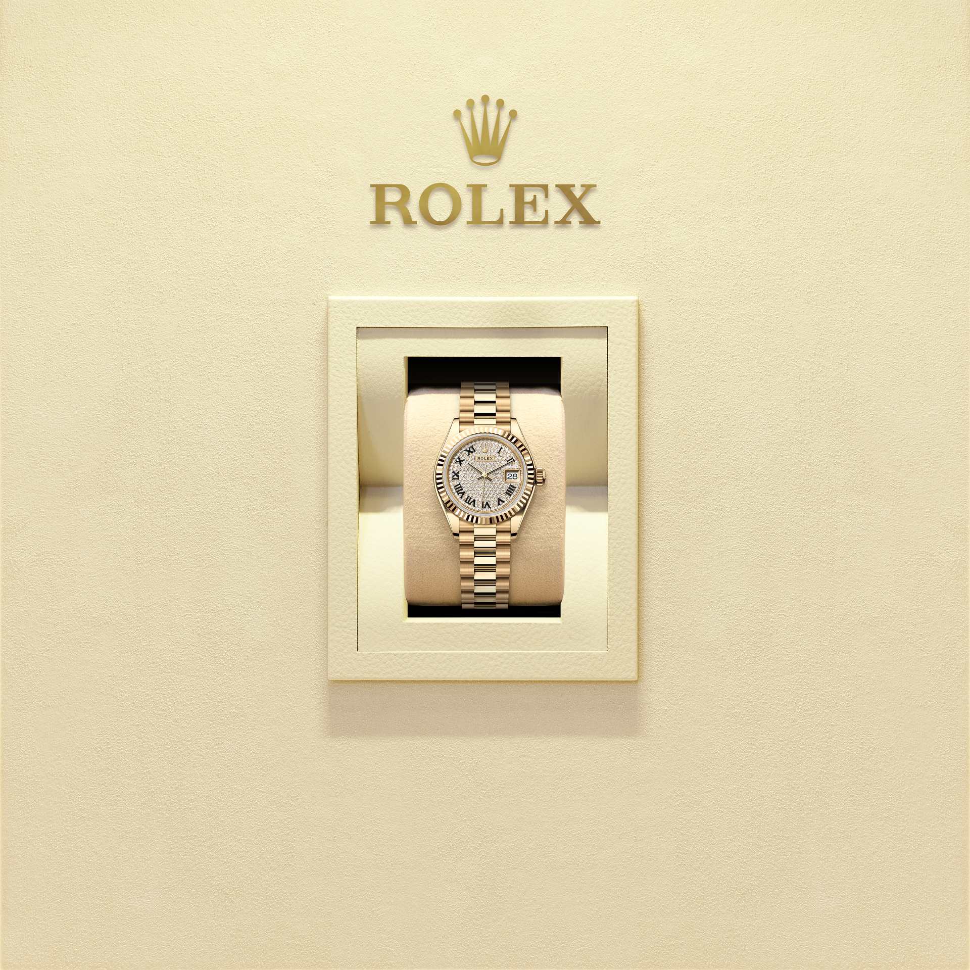 したがって、その刻みはバックケースにも施されており、防水性能の維持という同じ理由で、ロレックス独自のツールを用いてケースにねじ込まれていた。時を経て、ベゼルの刻みはデザインの要素となり、ロレックスのシンボルとなった。現在、フルーテッドベゼルは卓越性の象徴であり、このレディ デイトジャストではゴールドで製造されている。