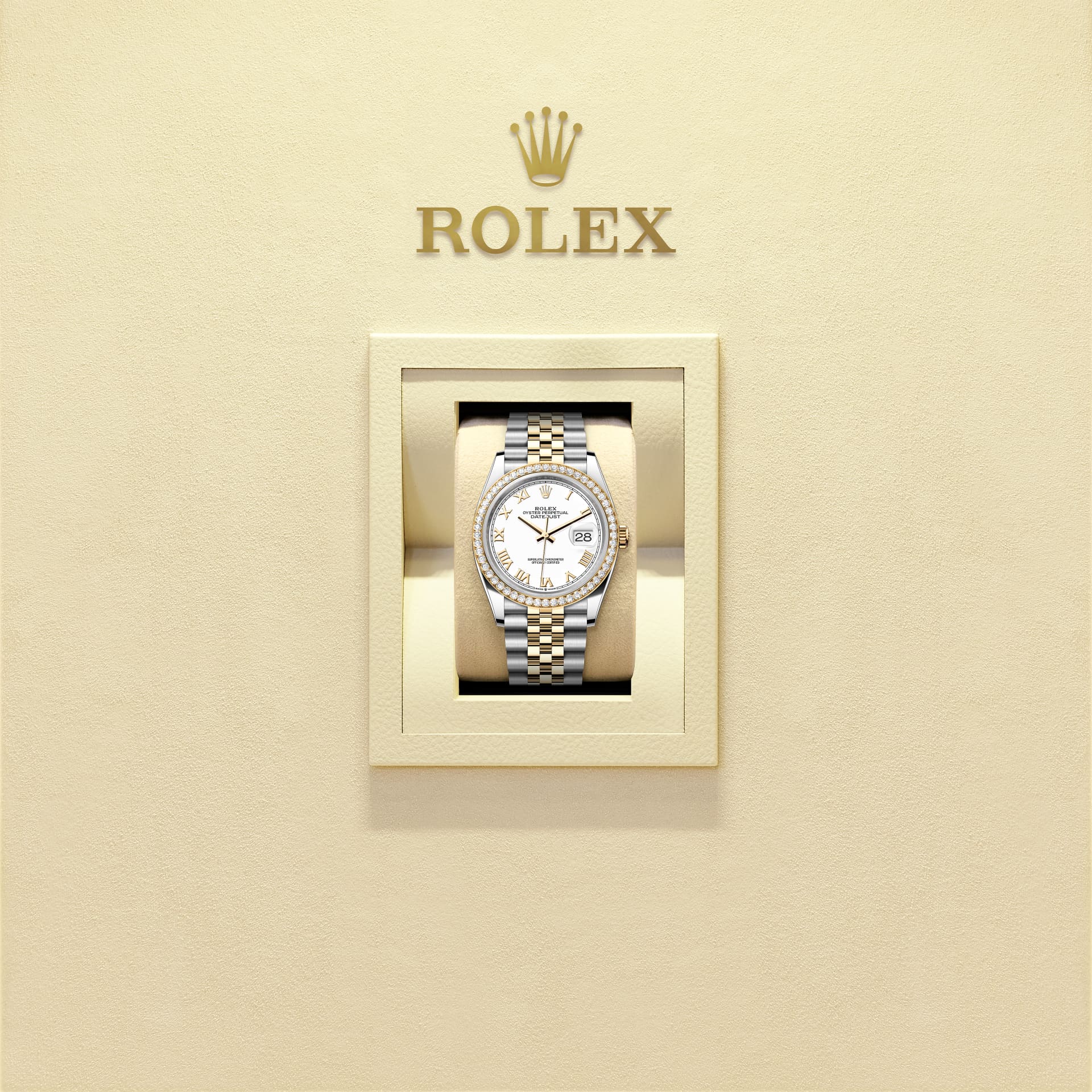 이 오이스터스틸과 옐로우 골드 소재의 오이스터 퍼페츄얼 데이트저스트 36 모델은 화이트 다이얼과 쥬빌리 브레슬릿을 갖추고 있습니다.