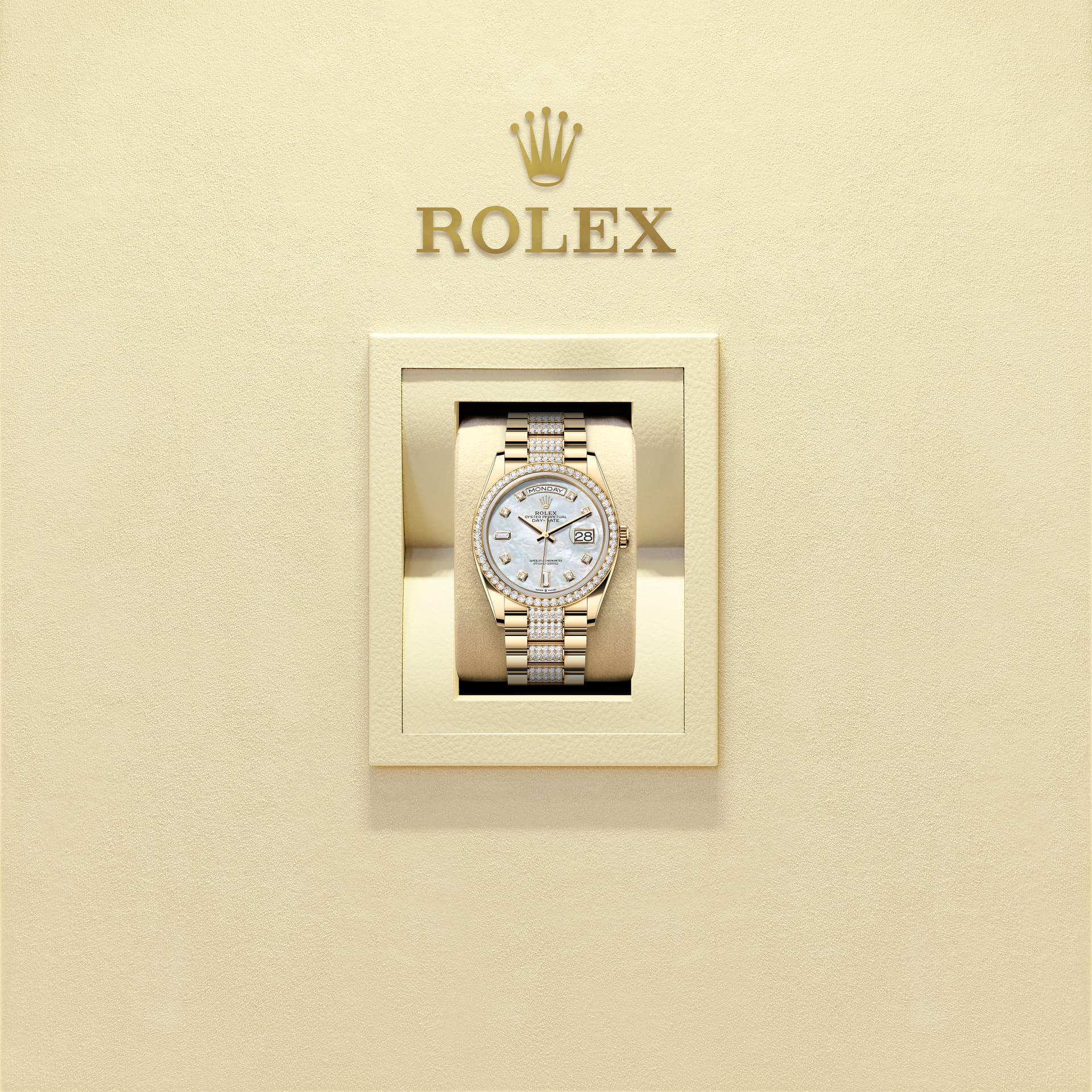다이아몬드가 세팅된 화이트 진주자개 다이얼과 다이아몬드 세팅 베젤, 다이아몬드가 세팅된 프레지던트 브레슬릿이 장착된 18캐럿 옐로우 골드 소재의 오이스터 퍼페츄얼 데이-데이트 36.