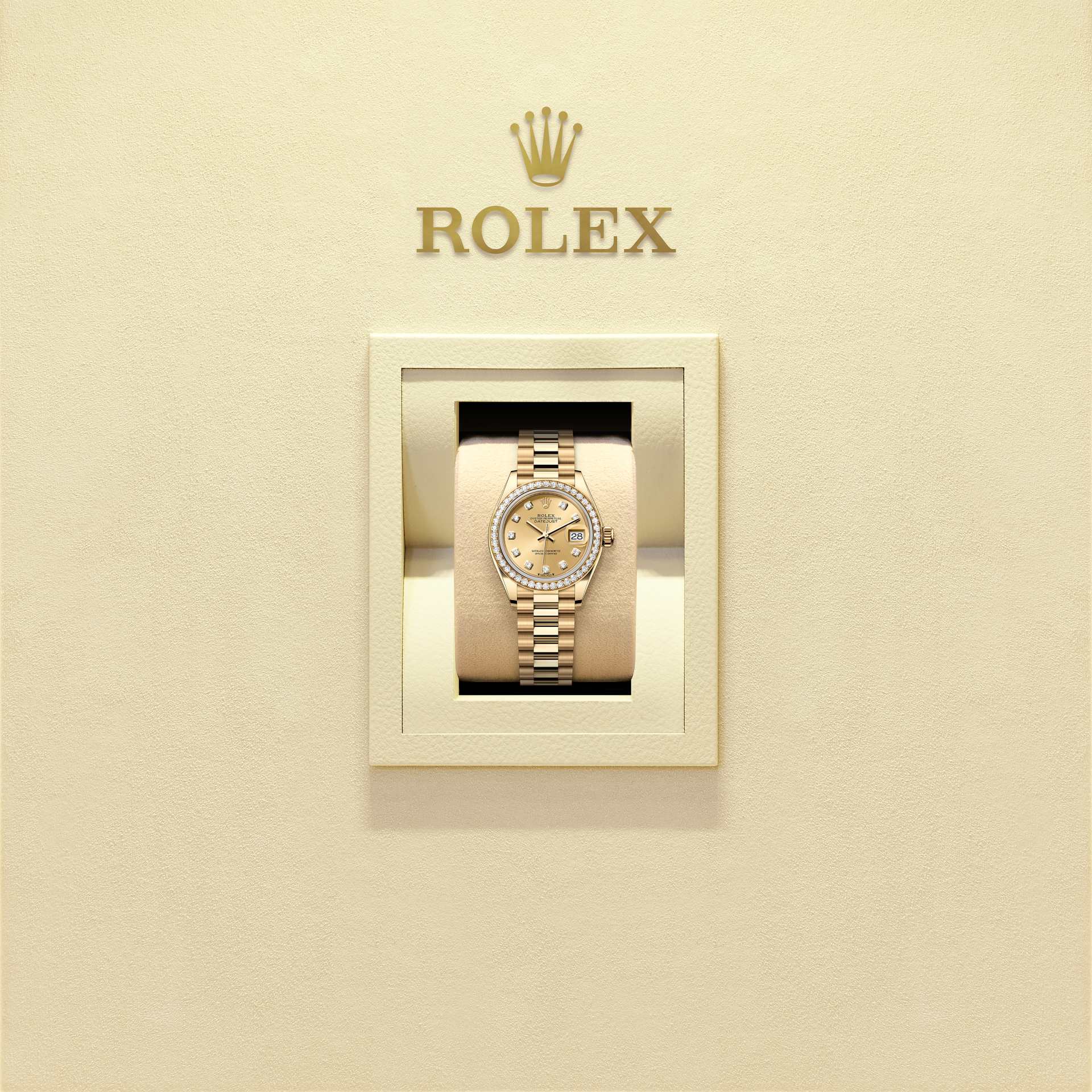 이 18캐럿 옐로우 골드 소재의 오이스터 퍼페츄얼 레이디-데이트저스트 모델은 샴페인 컬러, 다이아몬드 세팅 다이얼과 프레지던트 브레슬릿을 갖추고 있습니다.
