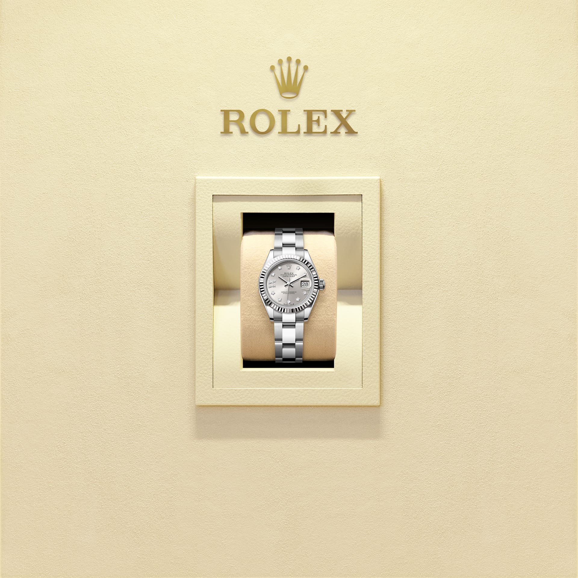 이 오이스터스틸과 화이트 골드 소재의 오이스터 퍼페츄얼 레이디-데이트저스트 모델은 다이아몬드가 세팅된 실버 다이얼과 오이스터 브레슬릿을 갖추고 있습니다.