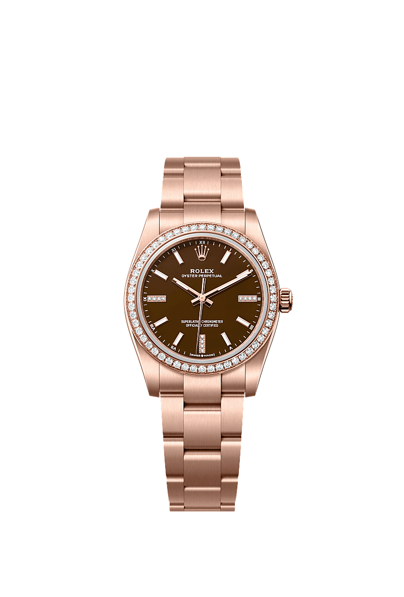 브라운 스톤, 다이아몬드 세팅 다이얼과 오이스터 브레슬릿을 갖춘 18캐럿 에버로즈 골드 소재의 오이스터 퍼페츄얼 34.