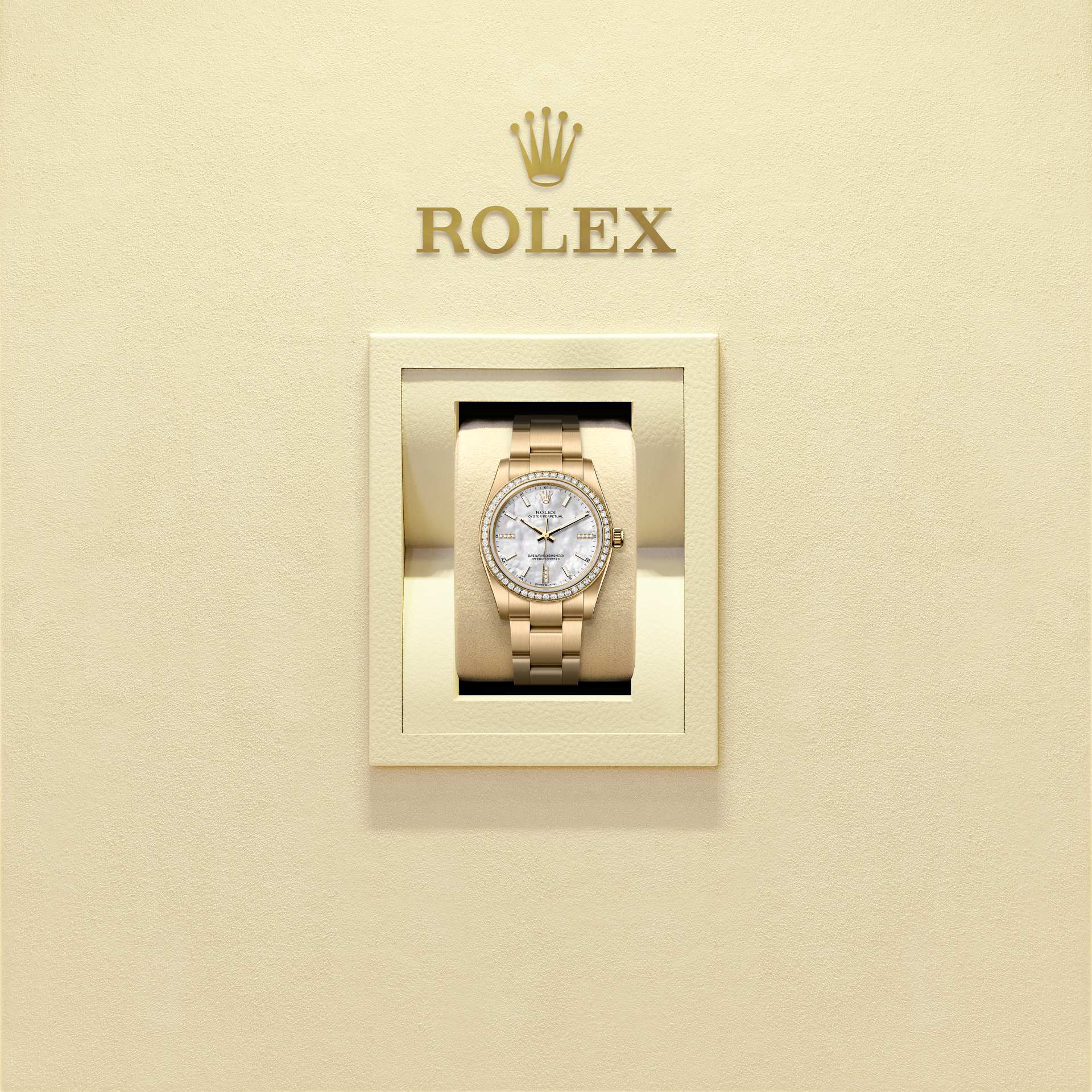 화이트 진주자개, 다이아몬드 세팅 다이얼과 오이스터 브레슬릿을 갖춘 18캐럿 옐로우 골드 소재의 오이스터 퍼페츄얼 34.