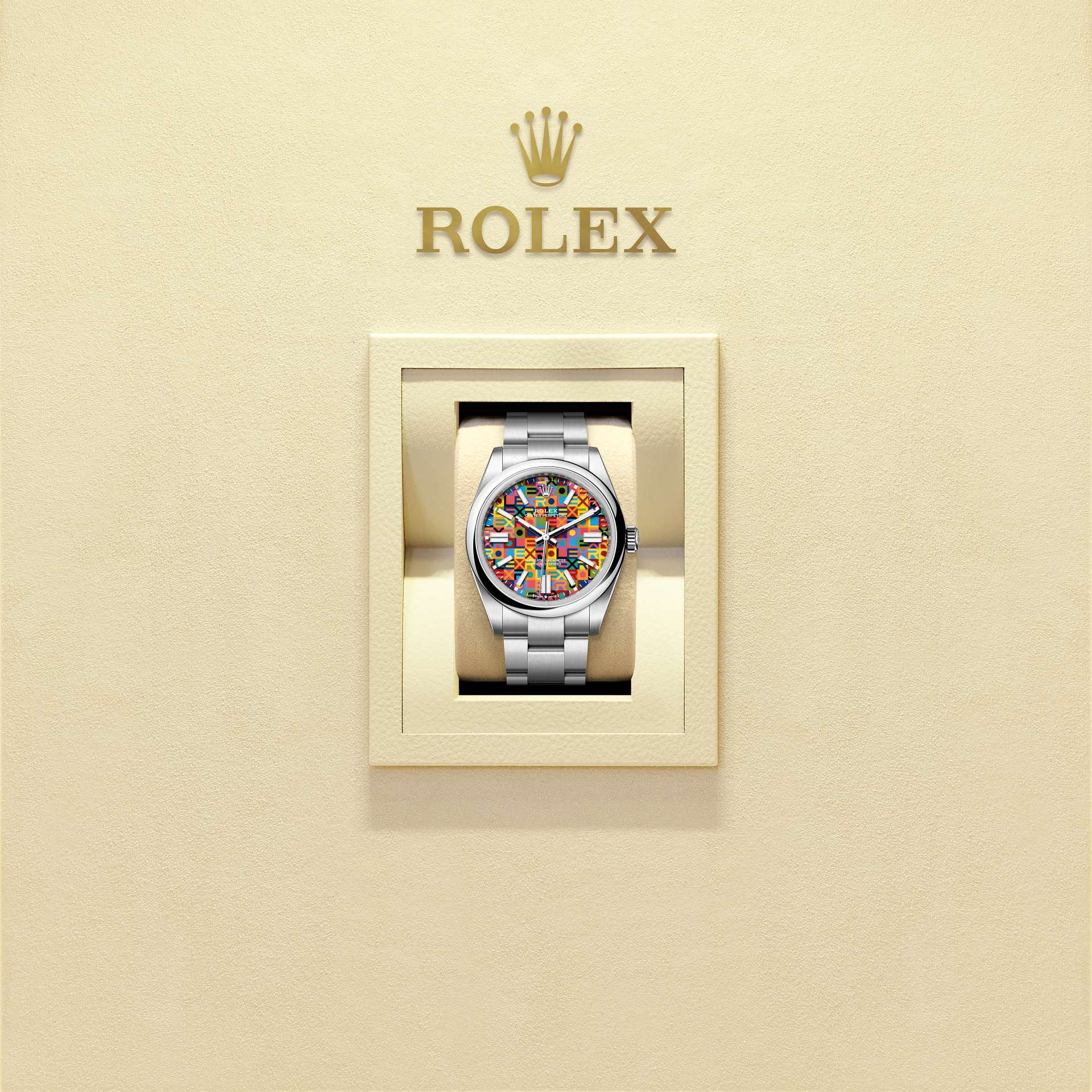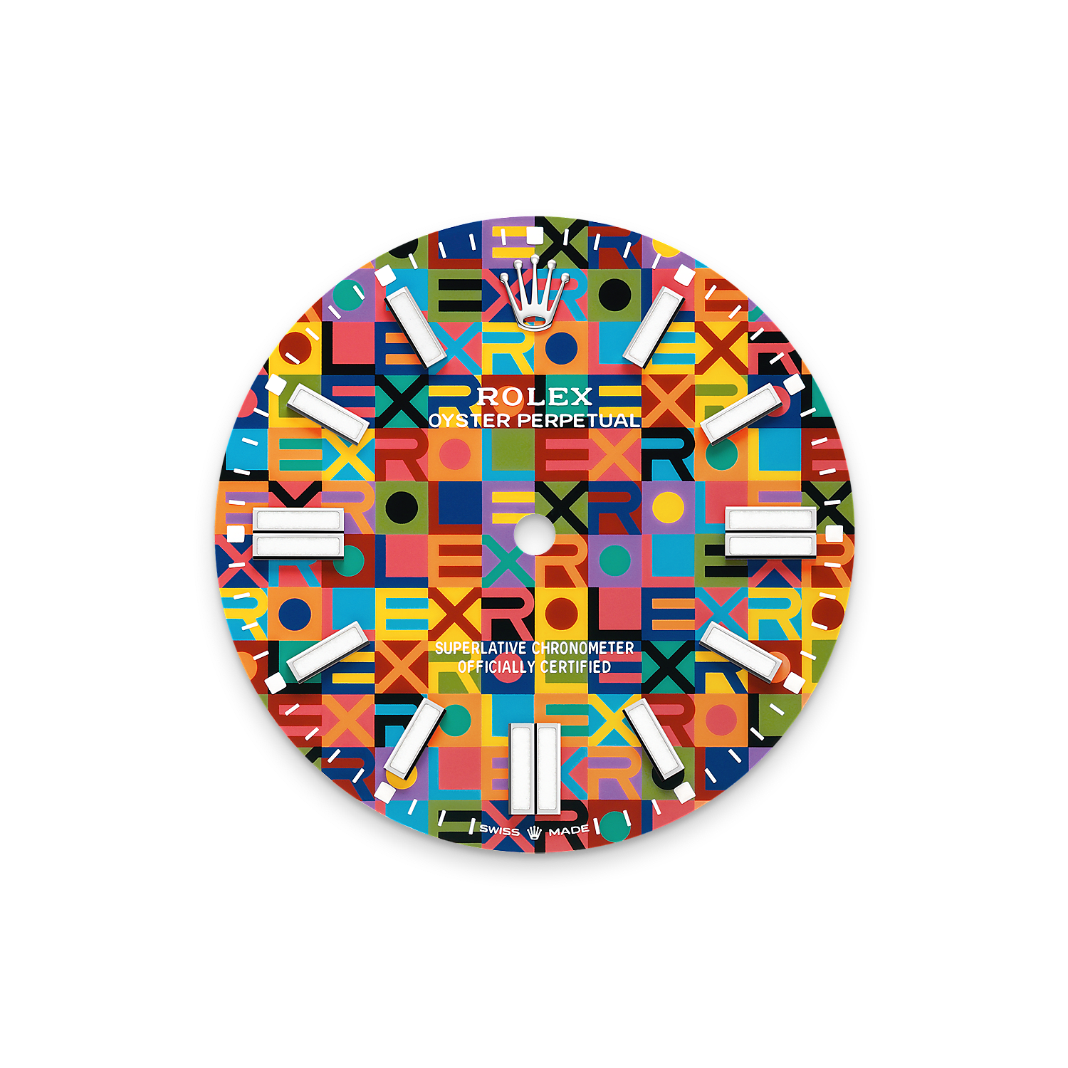 10가지 이상의 컬러가 대조를 이루며 롤렉스 명칭의 각 알파벳을 드러냅니다. 모든 색상을 전부 동시에 입히는 것이 아니라 한 번에 하나의 색상만을 입히는 만큼, 이 패턴을 구현하는 과정은 무척이나 까다롭습니다. 또한 모티프를 구성하는 모든 형태와 알파벳이 완벽한 위치에 배치되도록 하기 위해서는 극도의 정확성이 요구됩니다.