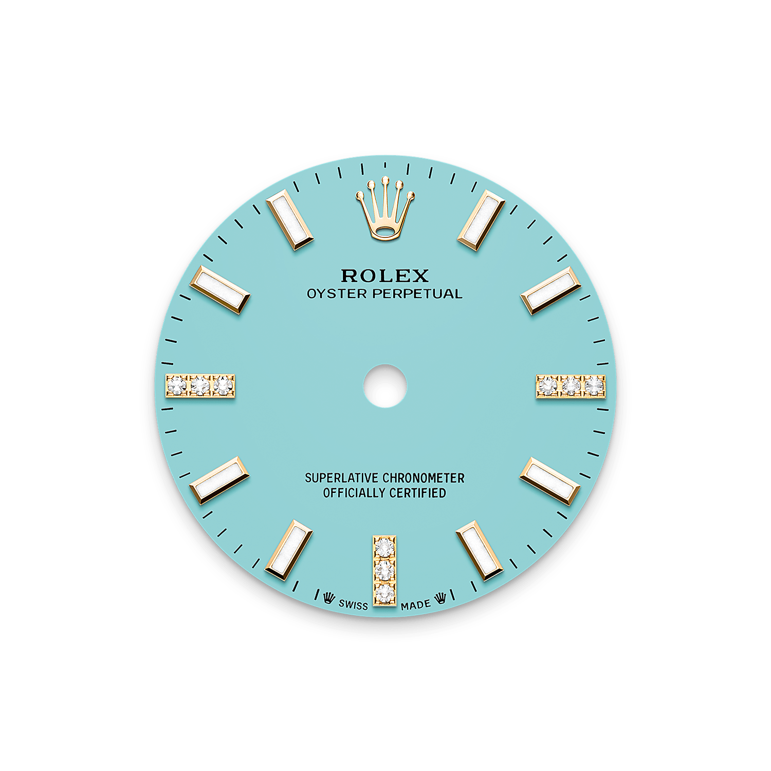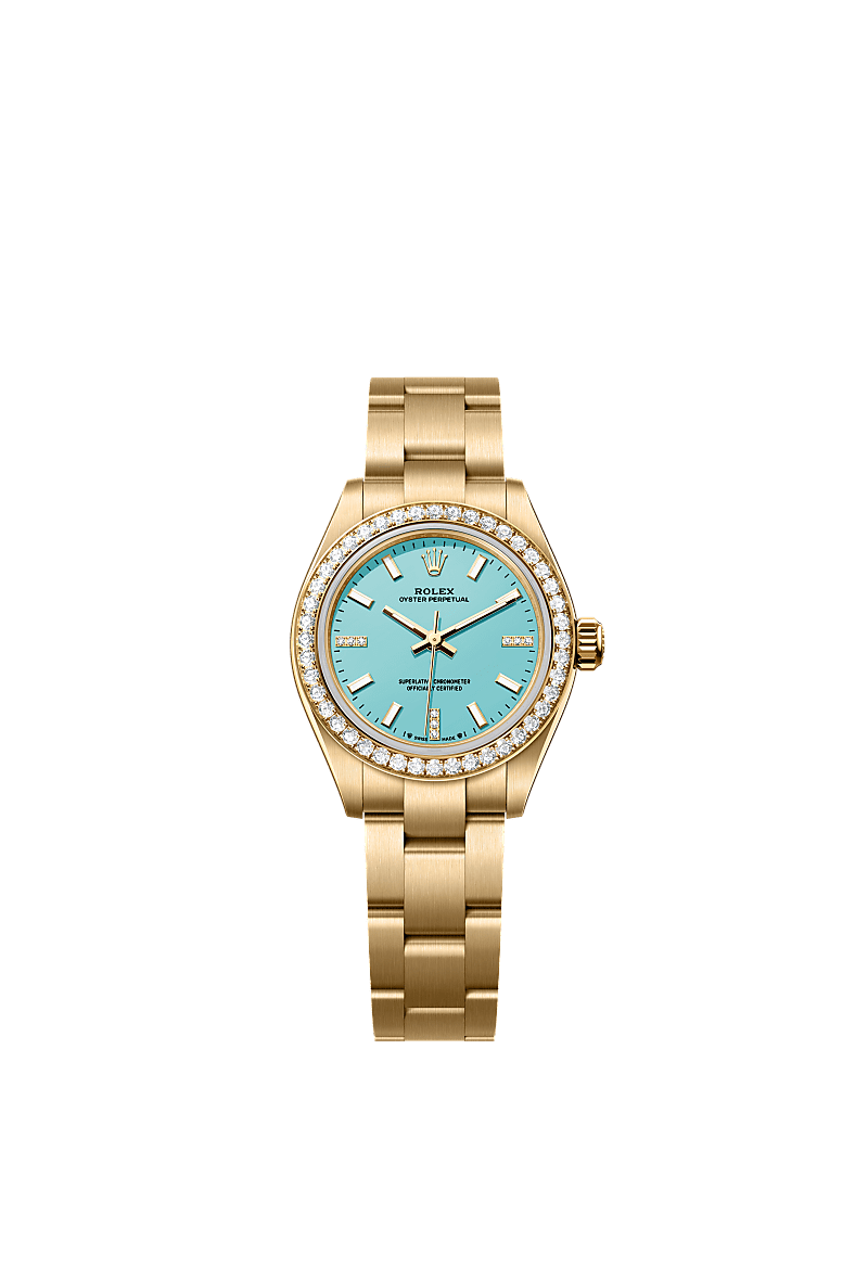 터콰이즈 블루, 다이아몬드 세팅 다이얼과 오이스터 브레슬릿을 갖춘 18캐럿 옐로우 골드 소재의 오이스터 퍼페츄얼 28.