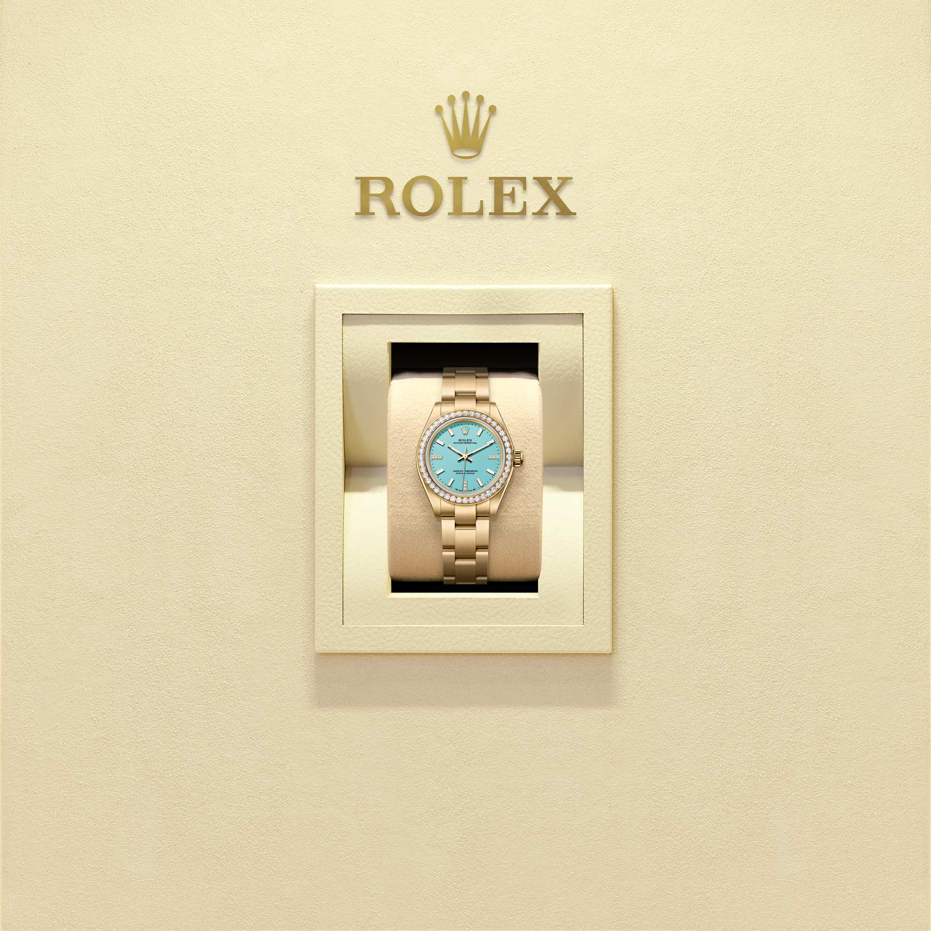 3시, 6시, 9시 방향에 18캐럿 골드 아워 마커, 9개의 다이아몬드 세팅 다이얼이 특징인 모델입니다. 오이스터 퍼페츄얼 라인을 위해 탄생한 이 컬러들은 먼지를 비롯한 여러 오염 물질로부터 철저히 보호된 작업장에서 세심하게 진행되는 래커 처리로부터 시작됩니다.