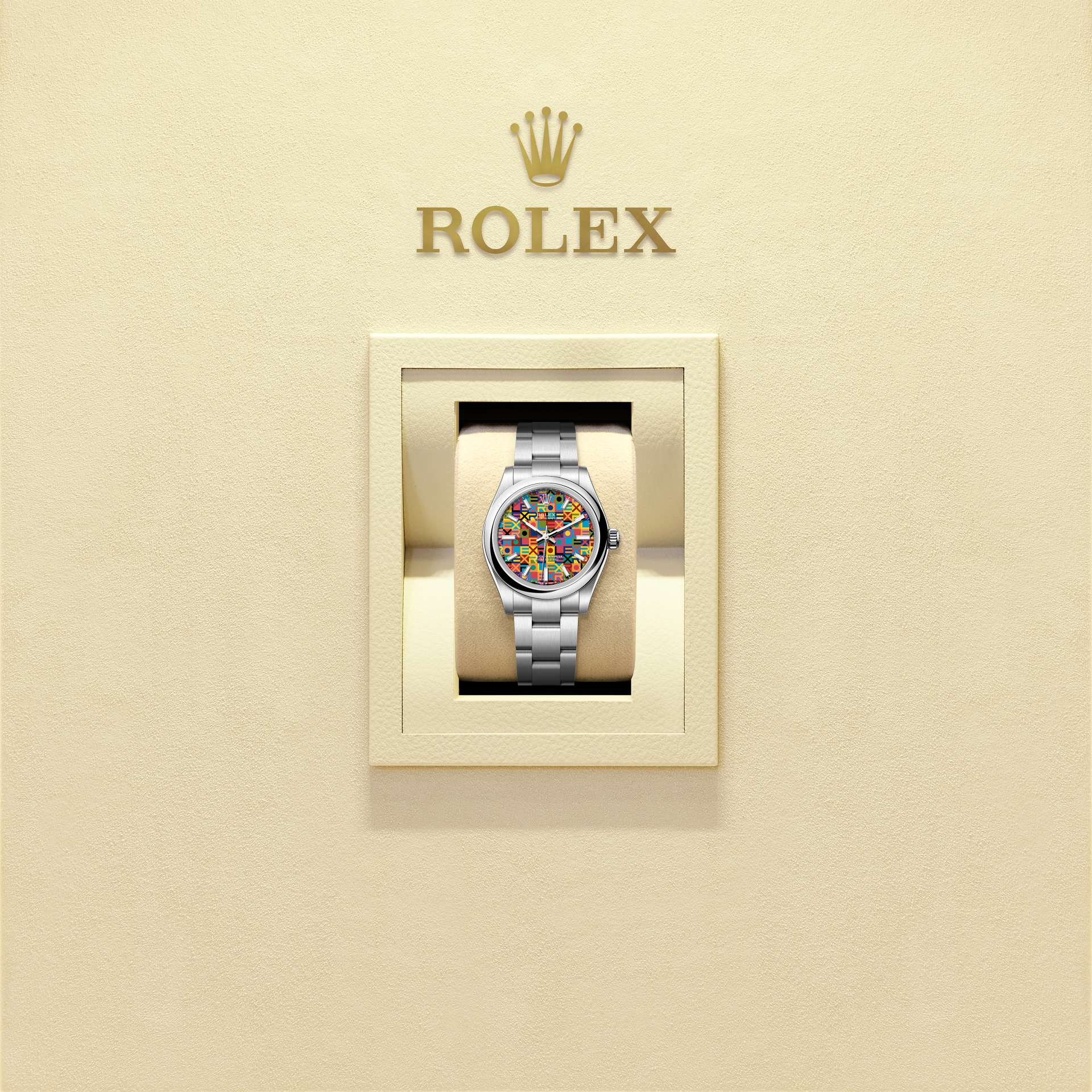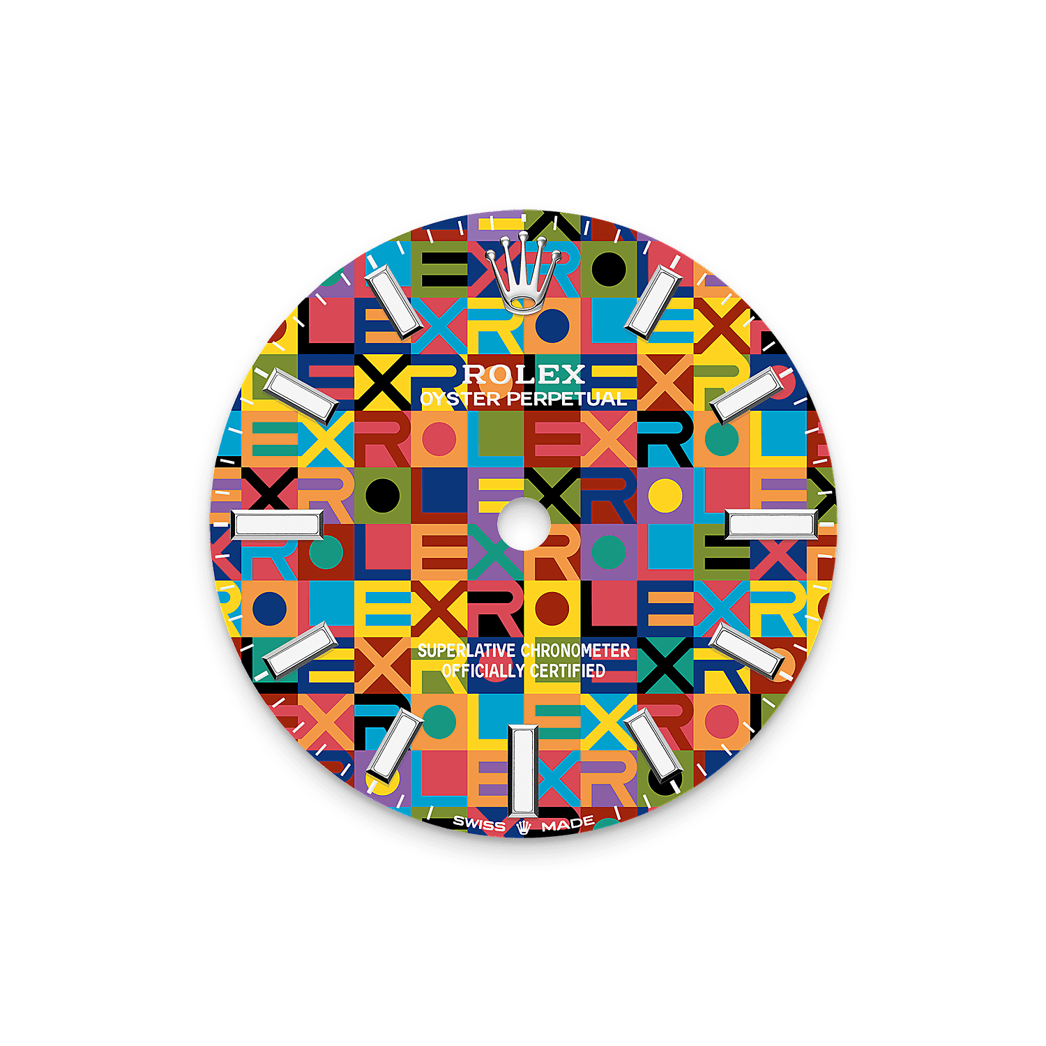 10가지 이상의 컬러가 대조를 이루며 롤렉스 명칭의 각 알파벳을 드러냅니다. 모든 색상을 전부 동시에 입히는 것이 아니라 한 번에 하나의 색상만을 입히는 만큼, 이 패턴을 구현하는 과정은 무척이나 까다롭습니다. 또한 모티프를 구성하는 모든 형태와 알파벳이 완벽한 위치에 배치되도록 하기 위해서는 극도의 정확성이 요구됩니다.