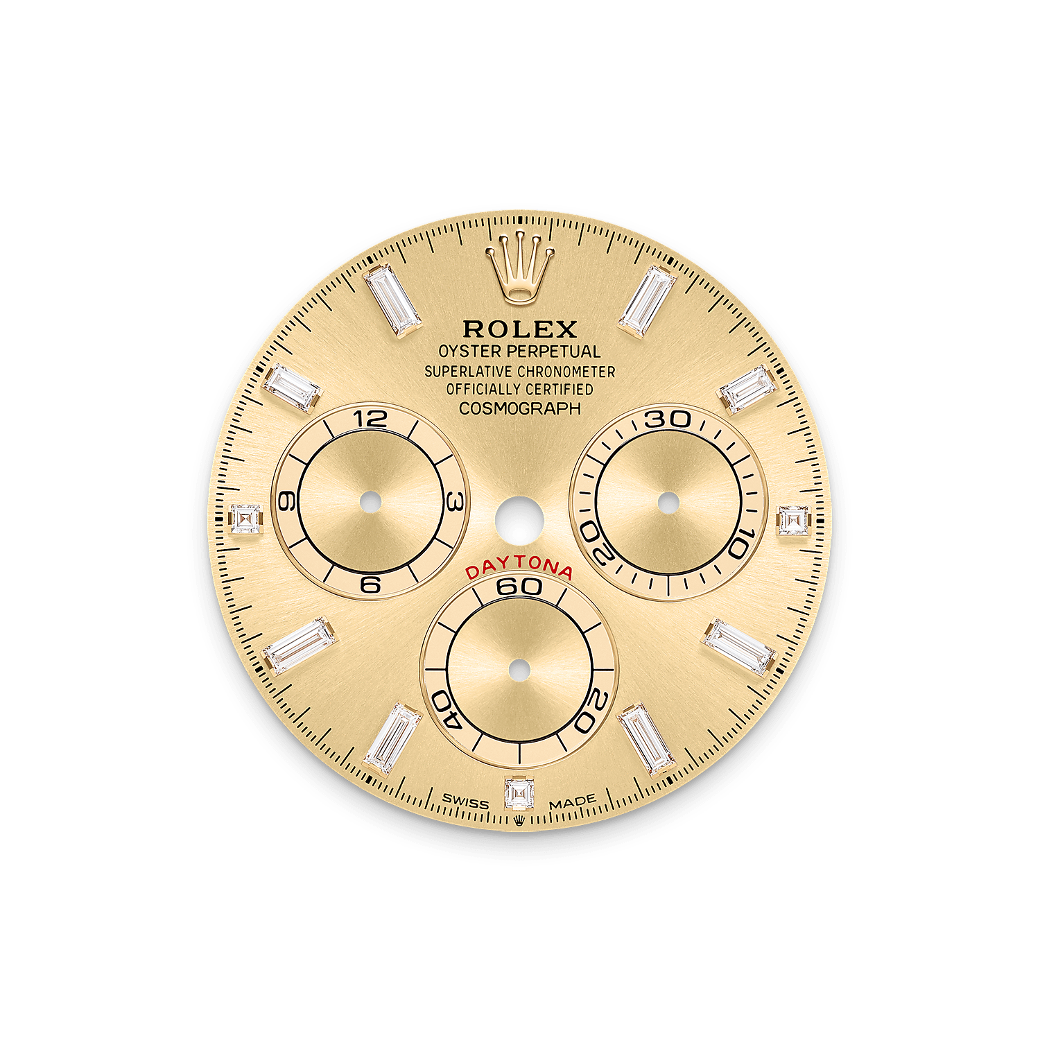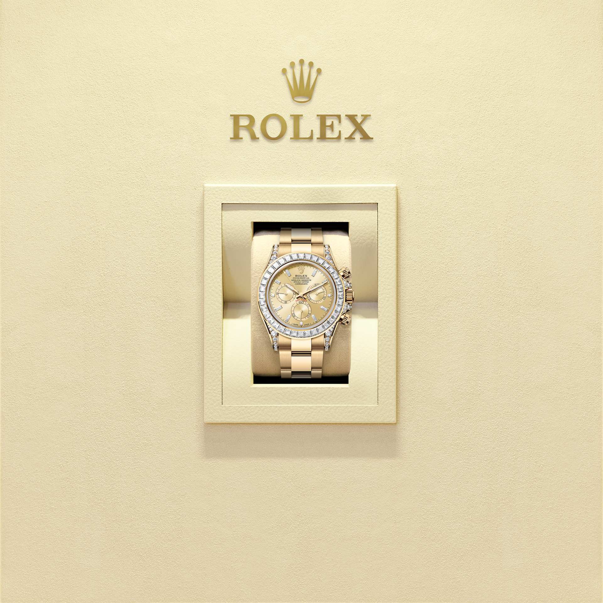 Oyster Perpetual Cosmograph Daytona dalam Emas kuning 18 karat dengan dail keemasan, bertatahkan berlian dan rantai Oyster, mempunyai bertatahkan berlian bezel dan lug set berlian.