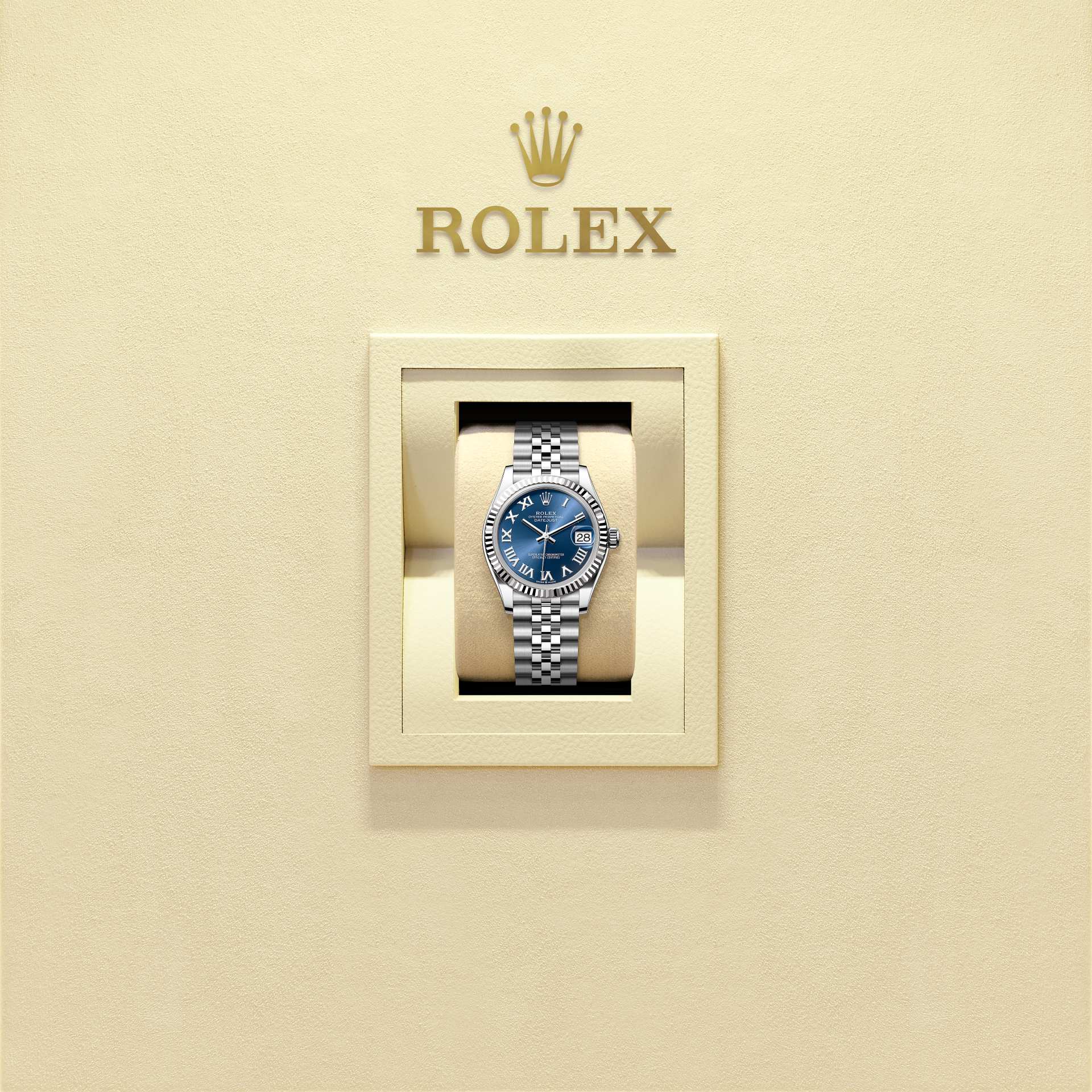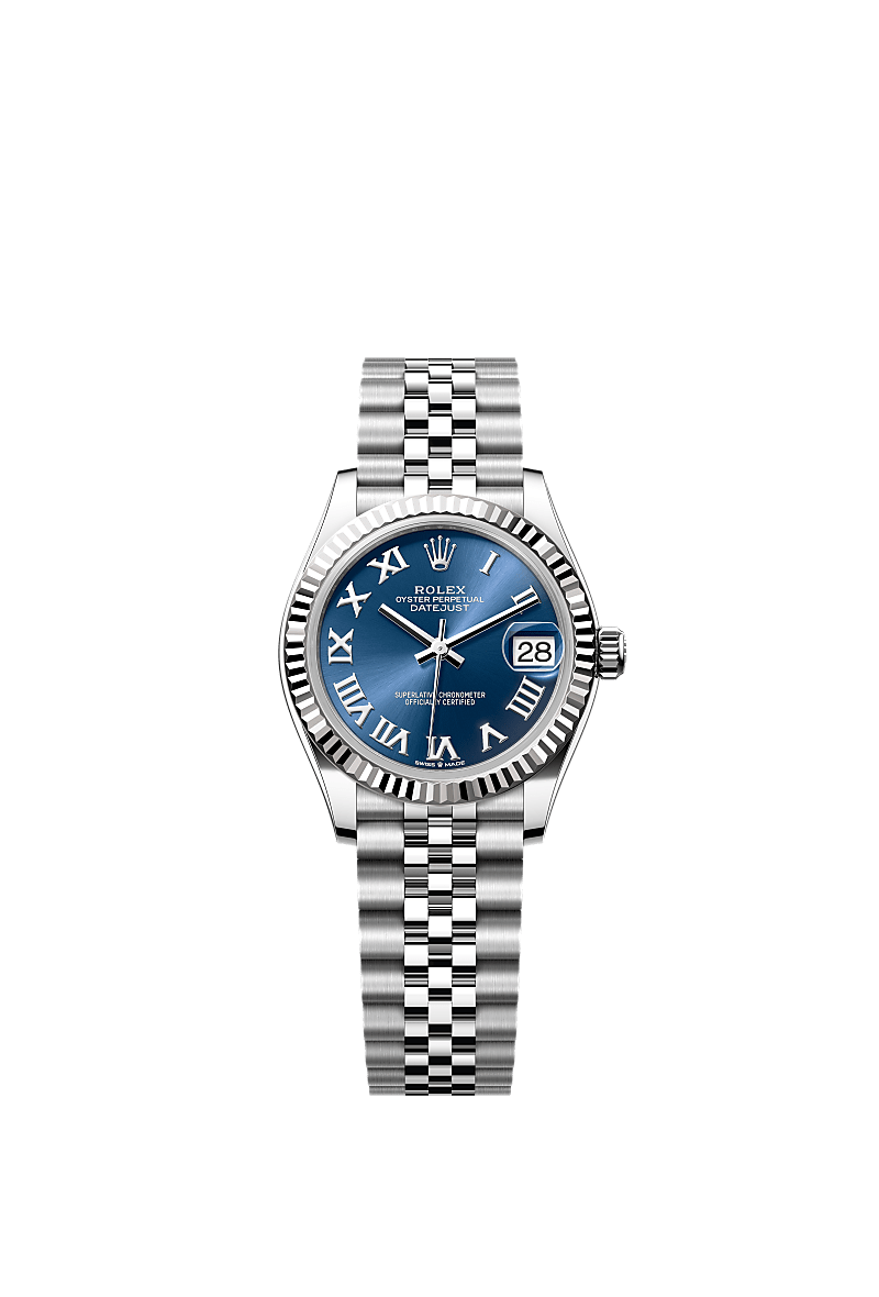 Oyster Perpetual Datejust 31 ini dalam Oystersteel dan emas putih mempunyai permukaan biru cerah dan rantai Jubilee.