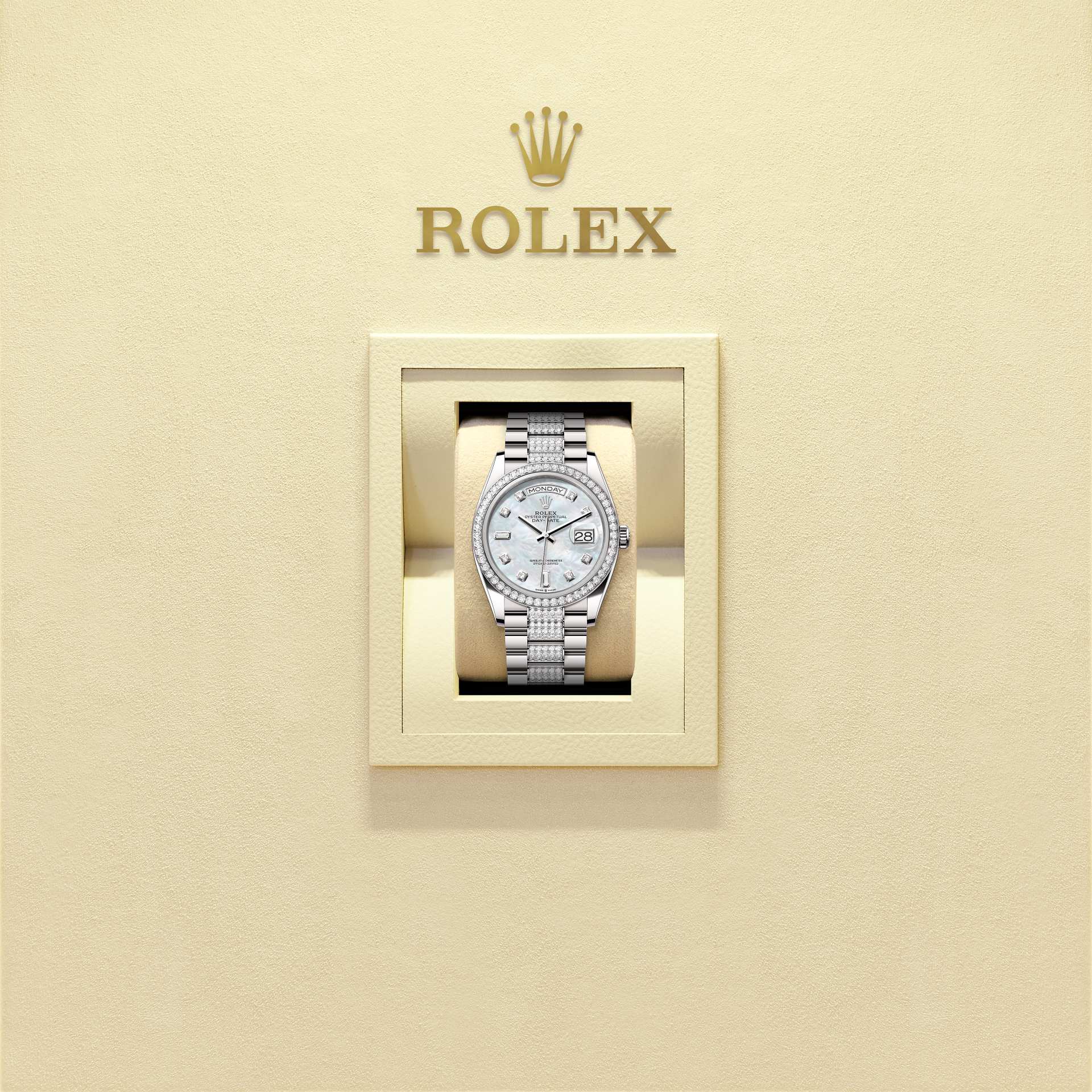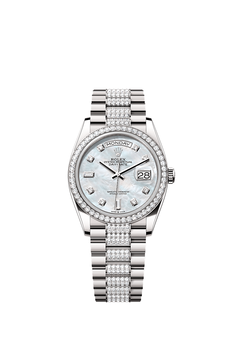 Oyster Perpetual Day-Date 36 dalam Emas putih 18 karat, dengan permukaan Indung mutiara putih, dipasangkan dengan berlian, bezel dipasangkan dengan berlian dan rantai set berlian President.