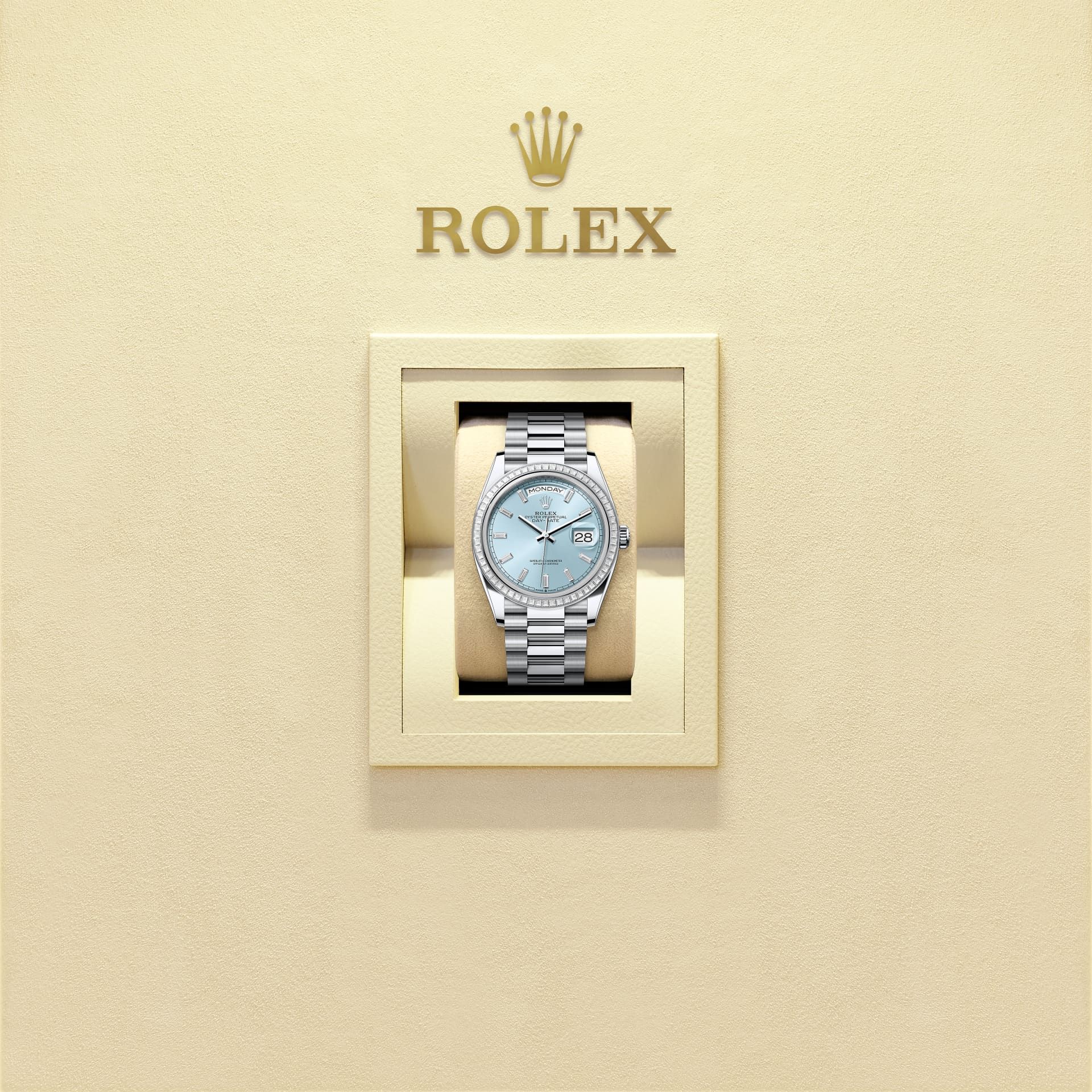 Oyster Perpetual Day-Date 36 dalam platinum, dengan permukaan biru ais, bertatahkan berlian, bezel bertatahkan berlian dan rantai President.