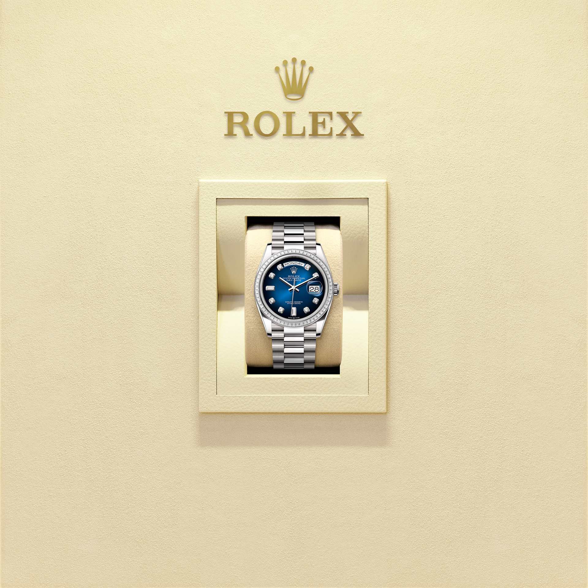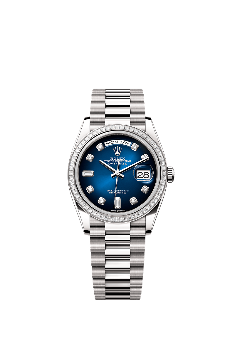 Oyster Perpetual Day-Date 36 dalam Emas putih 18 karat, dengan permukaan ombré biru, set berlian, bezel bertatahkan berlian dan rantai President.