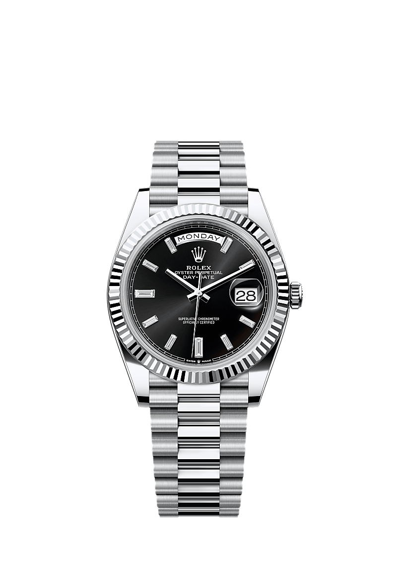 Oyster Perpetual Day-Date 40 dalam platinum dengan permukaan Hitam terang dipasangkan dengan berlian, bezel berjejalur dan rantai President.