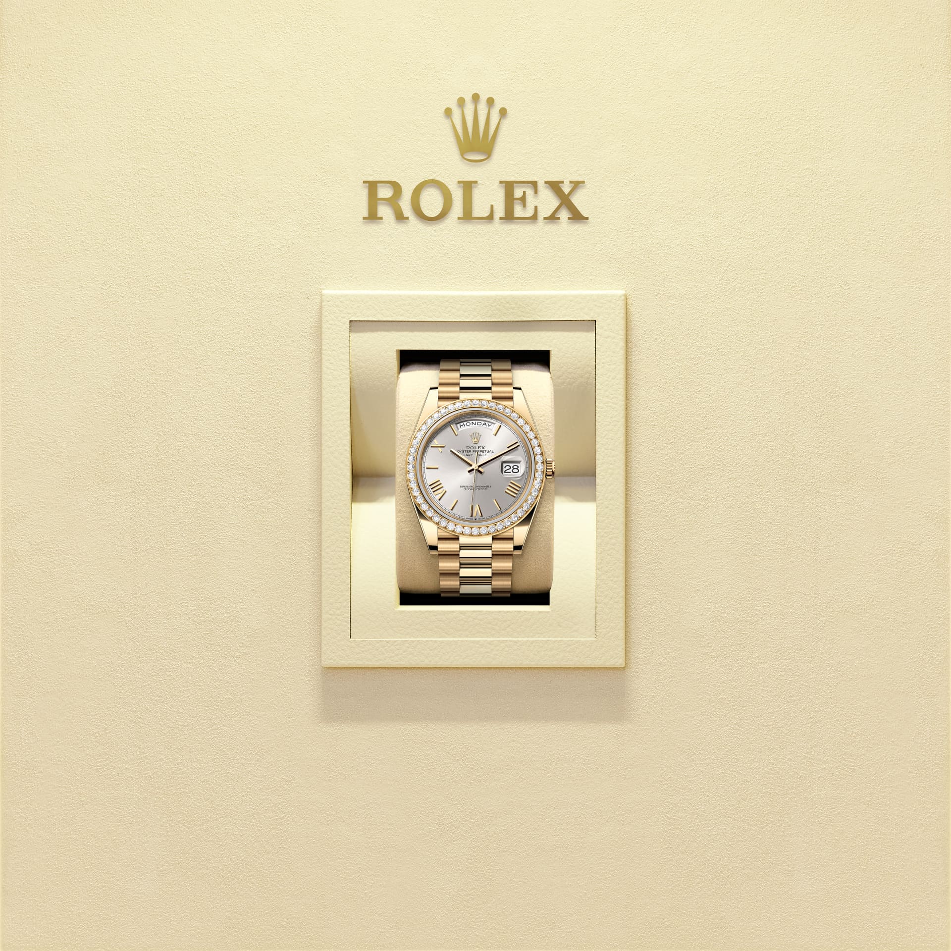 Oyster Perpetual Day-Date 40 dalam Emas kuning 18 karat dengan permukaan perak, bezel dipasangkan dengan berlian dan rantai President.