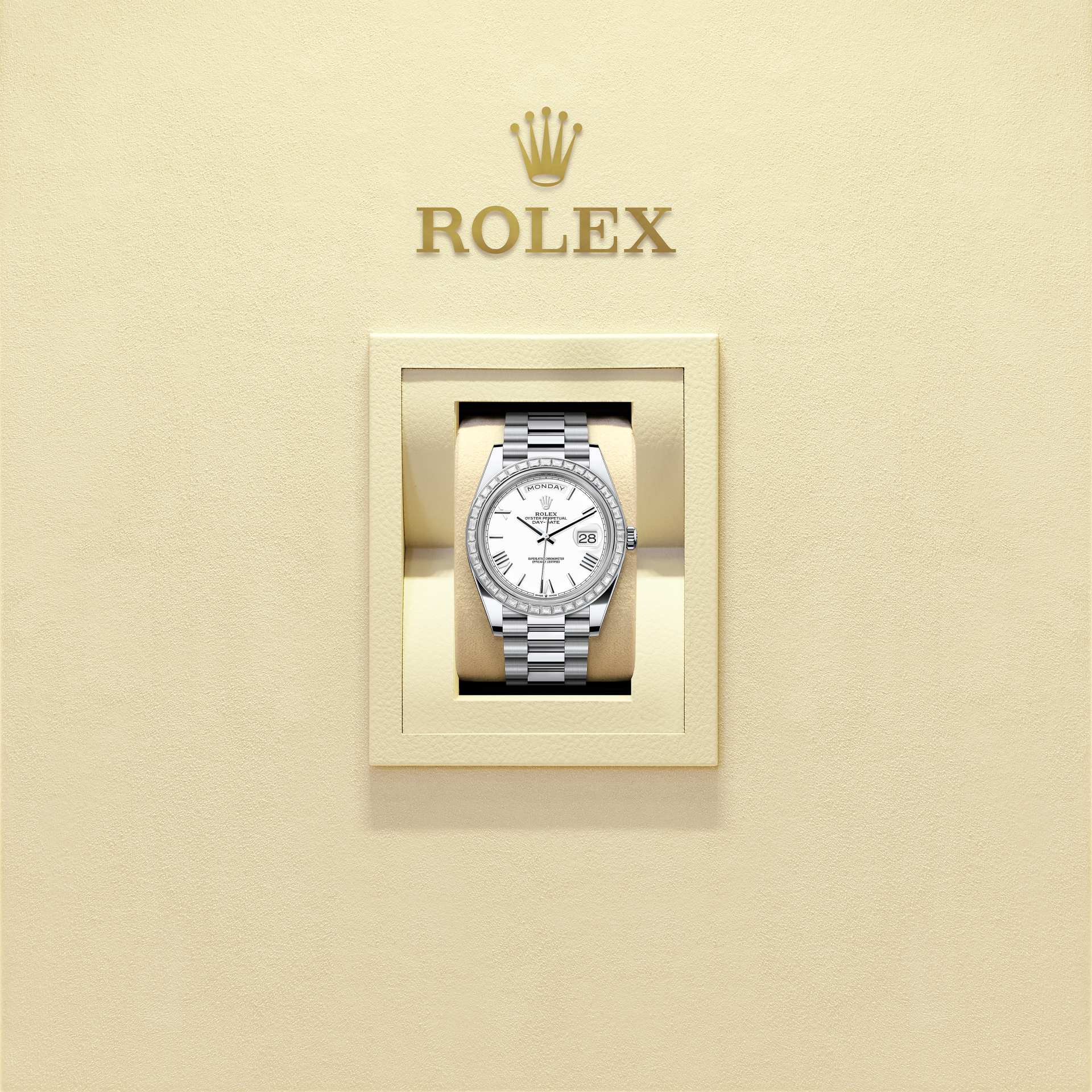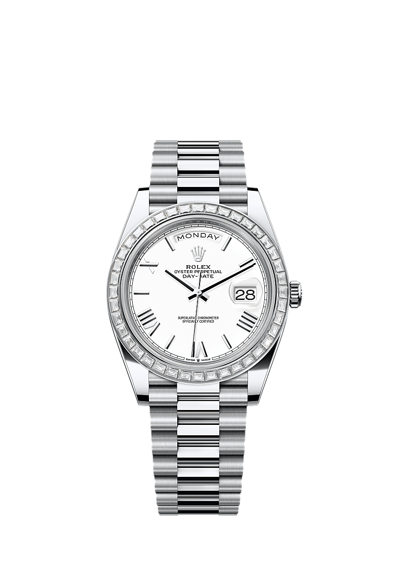 Oyster Perpetual Day-Date 40 dalam platinum dengan permukaan putih, bezel dipasangkan dengan berlian dan rantai President.