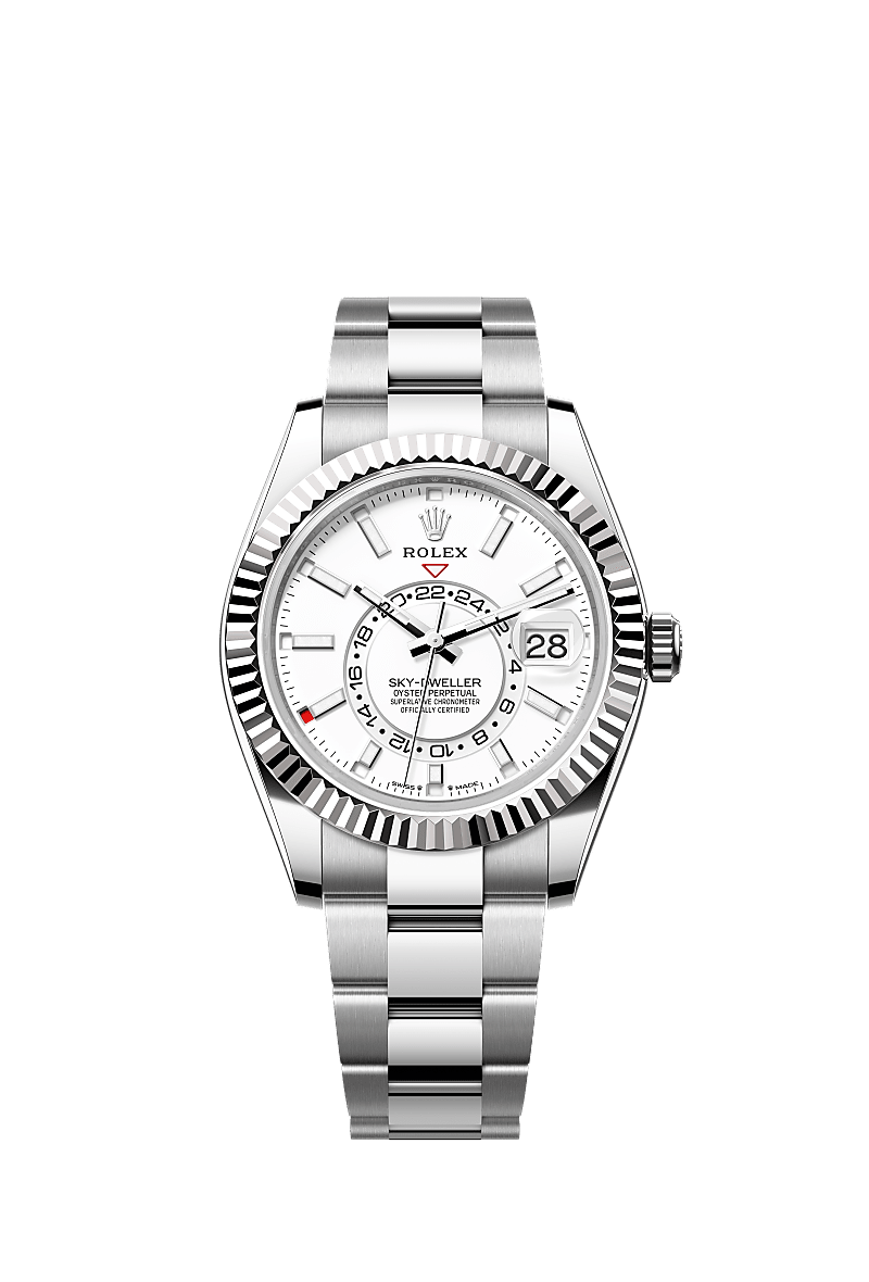 Oyster Perpetual Sky-Dweller dalam Oystersteel dan emas putih, dengan permukaan putih terang dan rantai Oyster.