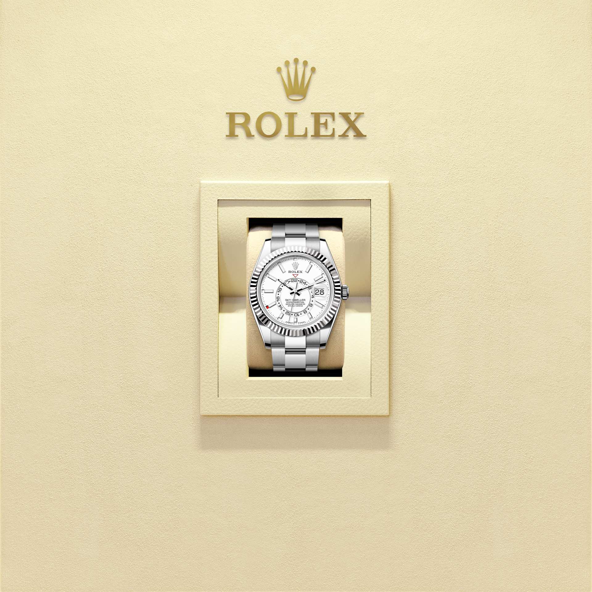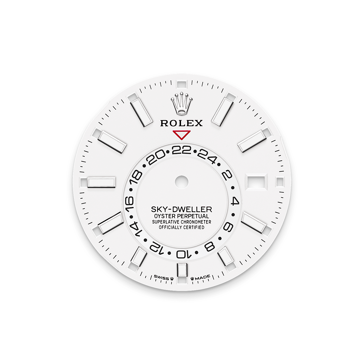 Sky-Dweller dipasang pada pautan kukuh rantai Oyster dalam Oystersteel, dalam penutup versi Rolesor putih, ataupun versi Rolesor kuning, iaitu rantai Oyster yang menggabungkan Oystersteel dan emas kuning.