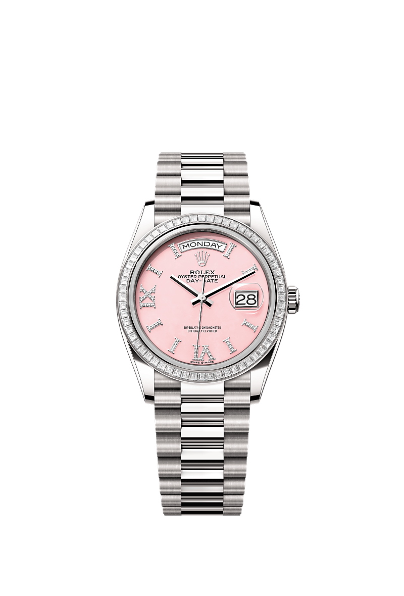 De Oyster Perpetual Day-Date 36 van 18 kt witgoud, met een roze opalen, met diamanten bezette wijzerplaat, een met diamanten bezette bezel en een President-band.