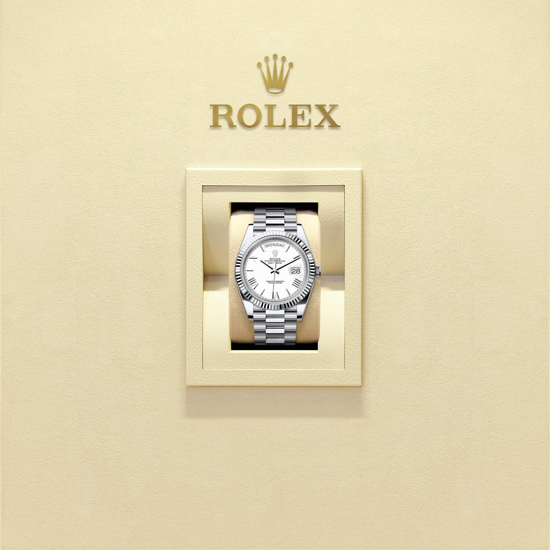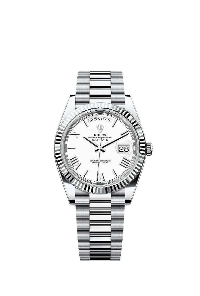 De Oyster Perpetual Day-Date 40 van platina met een witte wijzerplaat, een gekartelde bezel en een President-band.