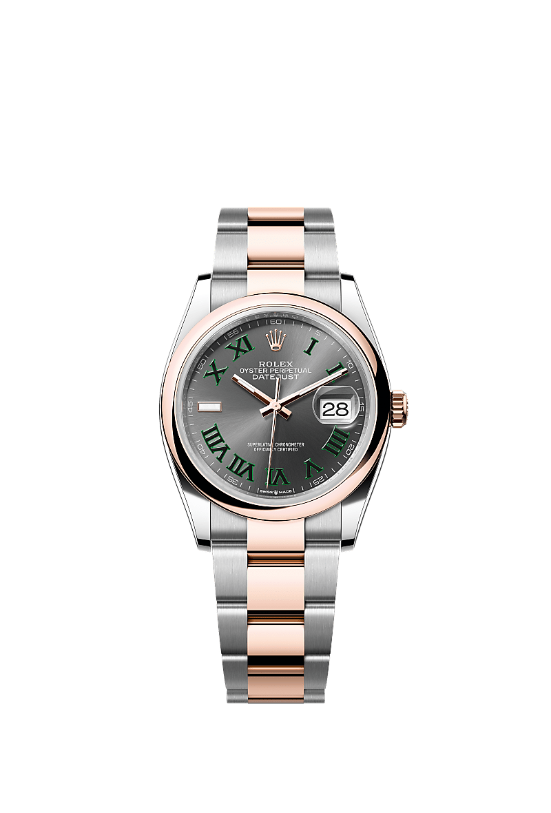 Deze Oyster Perpetual Datejust 36 van Oystersteel en Everose-goud heeft een leigrijze wijzerplaat en een Oyster-band.