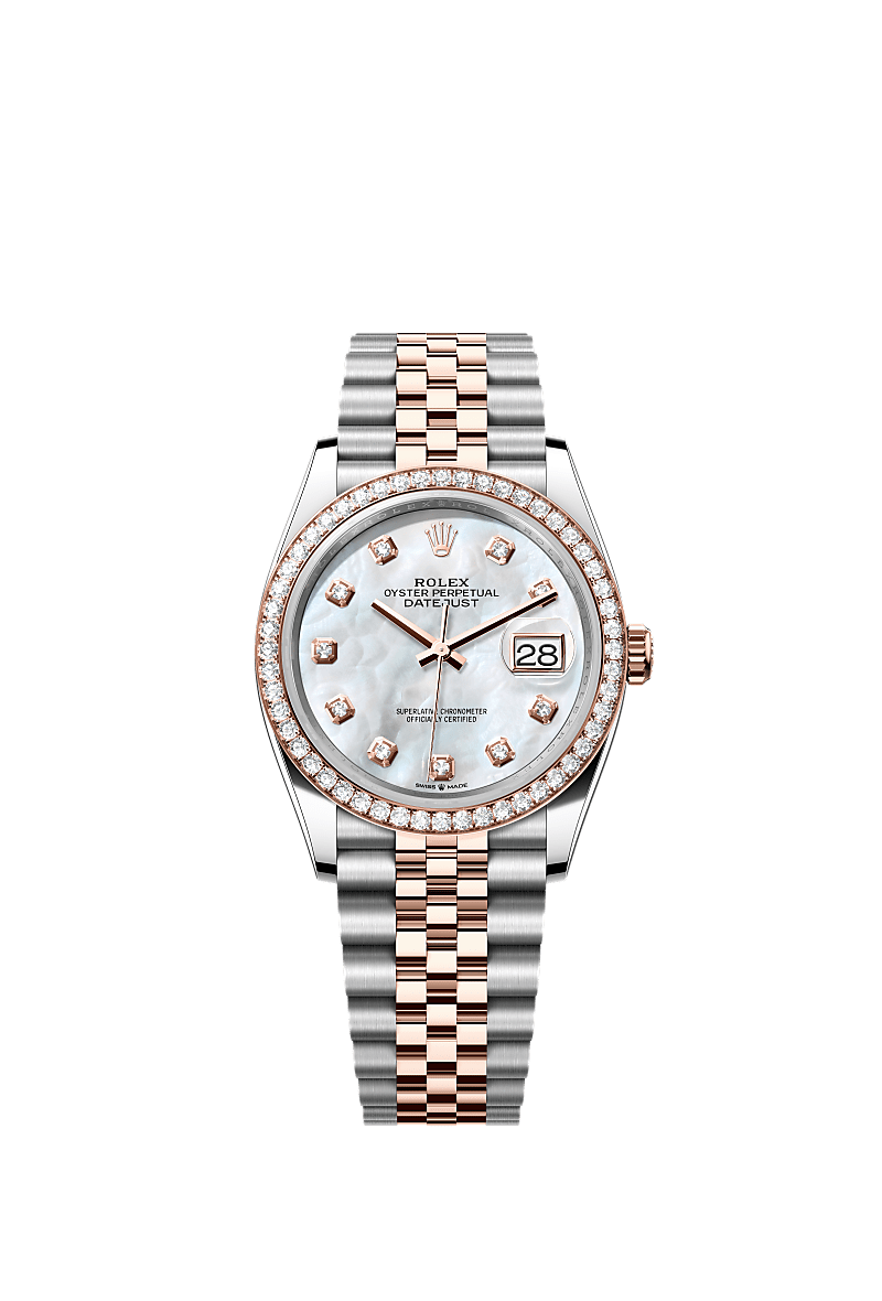 Deze Oyster Perpetual Datejust 36 van Oystersteel en Everose-goud heeft een wit parelmoeren, met diamanten bezette wijzerplaat en een Jubilee-band.