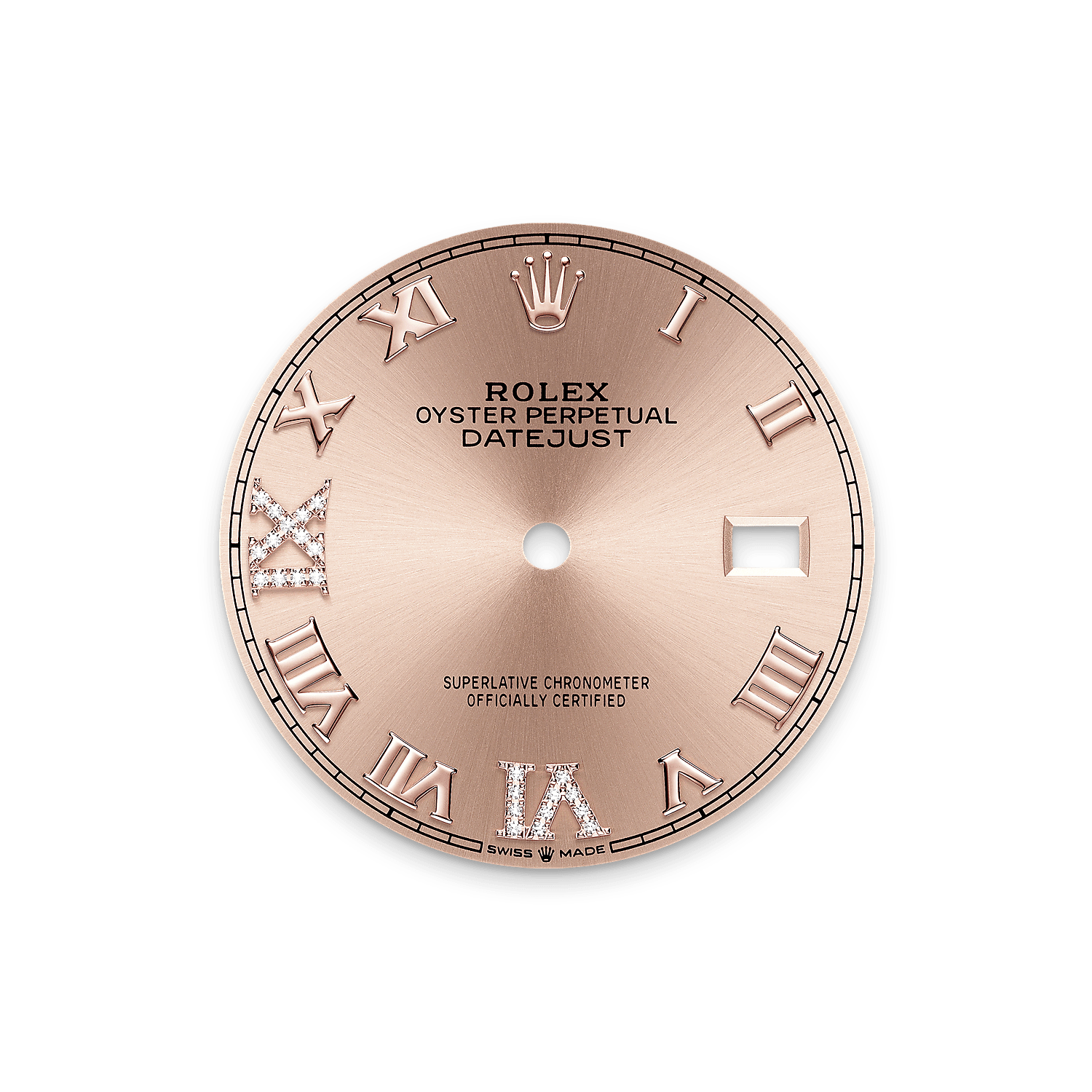 Deze wijzerplaat heeft een Romeinse VI en IX van 18 kt goud, bezet met 24 diamanten. Het sunray-motief zorgt voor subtiele lichtreflecties op veel wijzerplaten in de Oyster Perpetual-collectie. Het wordt verkregen door middel van meesterlijke borsteltechnieken, waarbij groeven worden gekerfd die vanaf het midden van de wijzerplaat naar buiten toe lopen.