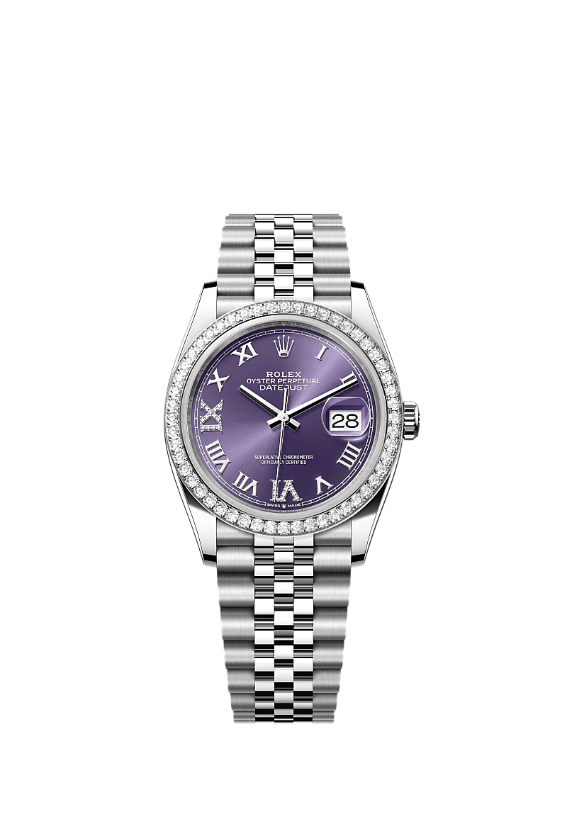 Deze Oyster Perpetual Datejust 36 van Oystersteel en witgoud heeft een auberginekleurige, met diamanten bezette wijzerplaat en een Jubilee-band.