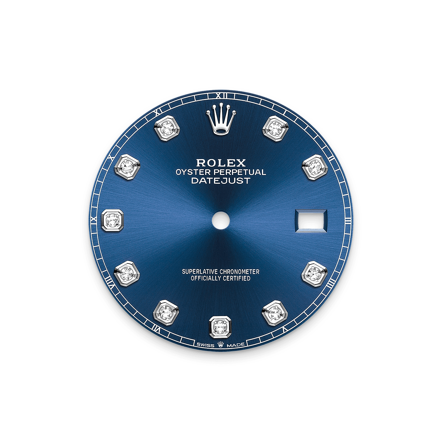 Deze wijzerplaat heeft diamanten in 18 kt gouden zettingen. Het sunray-motief zorgt voor subtiele lichtreflecties op veel wijzerplaten in de Oyster Perpetual-collectie. Het wordt verkregen door middel van meesterlijke borsteltechnieken, waarbij groeven worden gekerfd die vanaf het midden van de wijzerplaat naar buiten toe lopen.