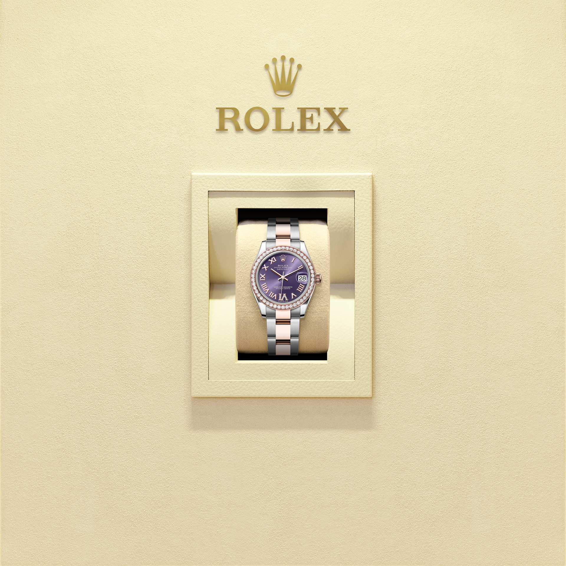 Deze Oyster Perpetual Datejust 31 van Oystersteel en Everose-goud heeft een auberginekleurige, met diamanten bezette wijzerplaat en een Oyster-band.