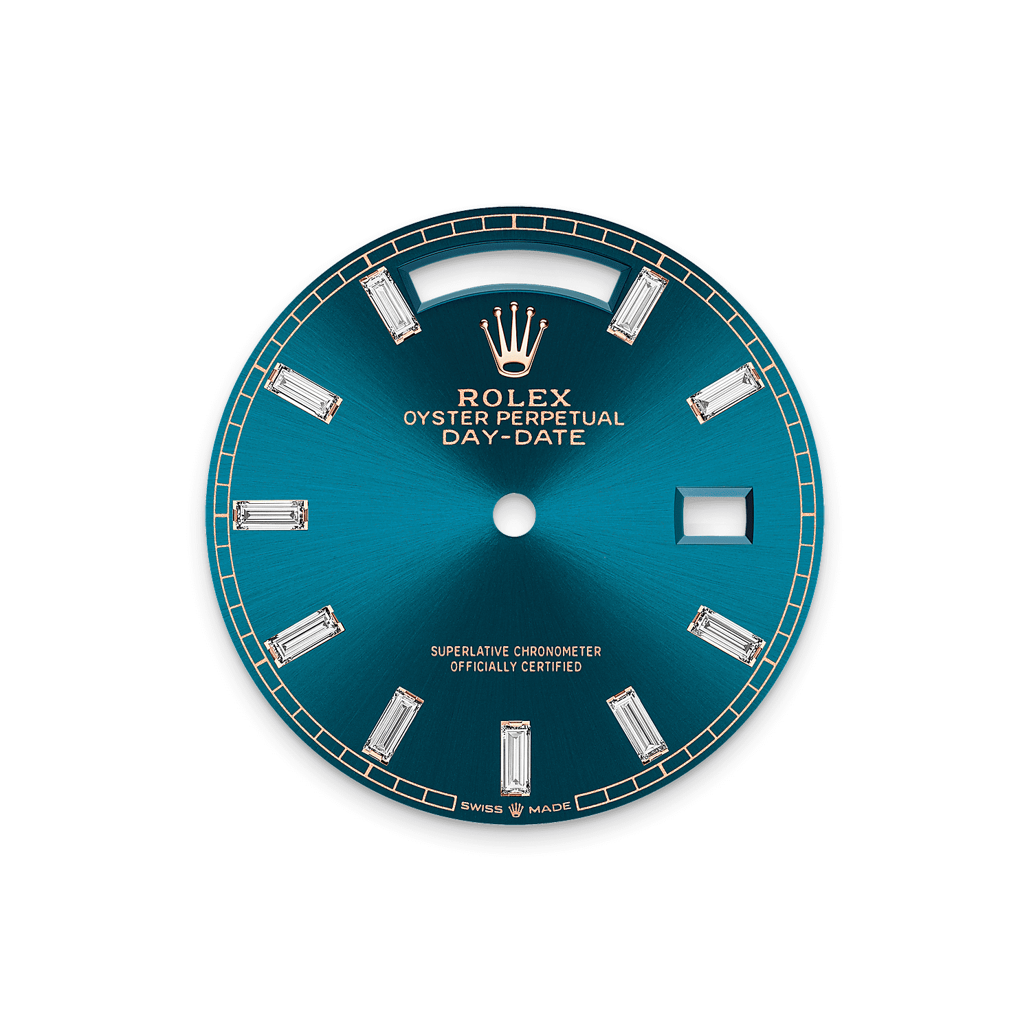 Deze wijzerplaat heeft 10 baguette-geslepen diamanten. Het sunray-motief zorgt voor subtiele lichtreflecties op veel wijzerplaten in de Oyster Perpetual-collectie. Het wordt verkregen door middel van meesterlijke borsteltechnieken, waarbij groeven worden gekerfd die vanaf het midden van de wijzerplaat naar buiten toe lopen.