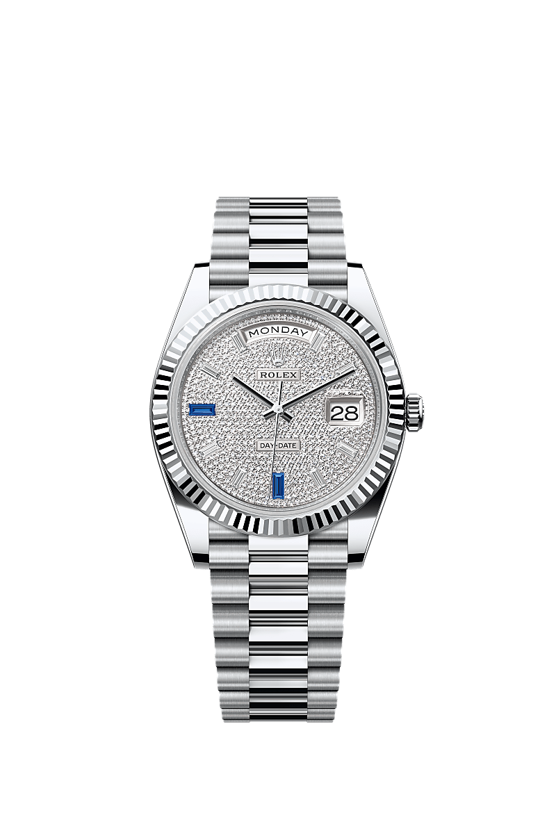 De Oyster Perpetual Day-Date 40 van platina met een met diamanten belegde wijzerplaat, een gekartelde bezel en een President-band.