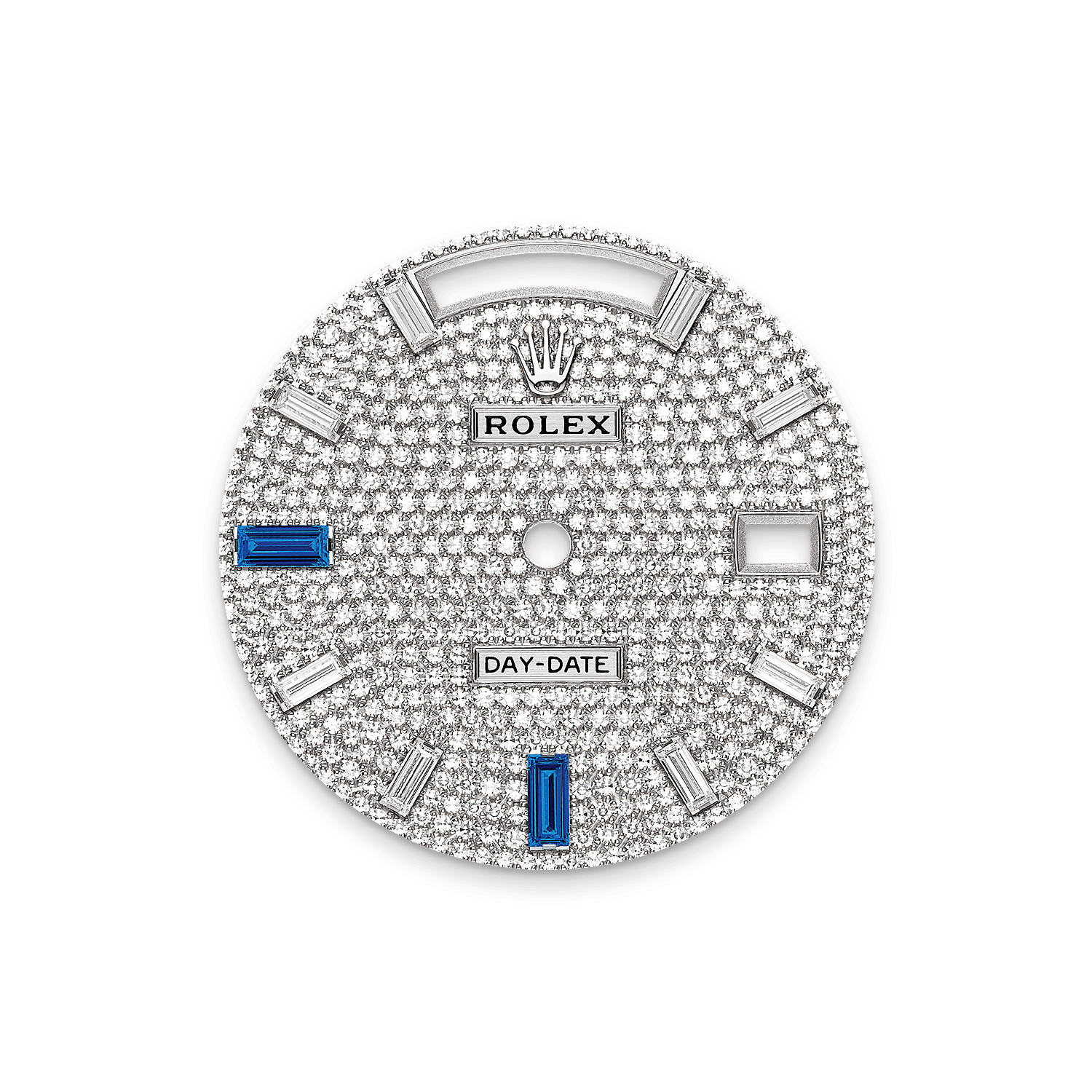 Deze wijzerplaat heeft 8 baguette-geslepen diamanten en 2 baguette-geslepen saffieren op 6 en 9 uur. Diamanten, saffieren, robijnen, smaragden: alleen de meest edele en kostbare stenen worden geselecteerd voor Rolex-horloges. Het merk heeft de inhouse deskundigheid en apparatuur die nodig zijn om alle modellen uit de collectie van edelstenen te kunnen voorzien.
