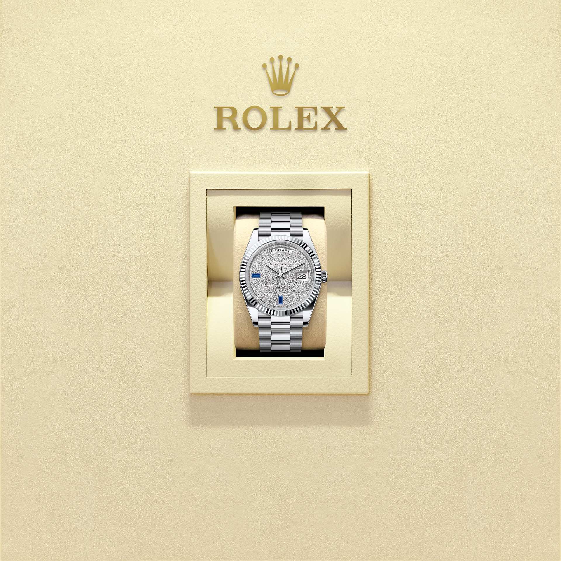 Daarom waren de kartels identiek aan die op de achterkant van het horloge, die eveneens op de kast werd vastgeschroefd voor de waterdichtheid met speciaal Rolex-gereedschap. Na verloop van tijd kregen de kartels echter een meer esthetische functie en werden ze een kenmerk van een echte Rolex. Tegenwoordig is de gekartelde bezel een teken van onderscheid. Op deze Day-Date 40 is hij van platina.