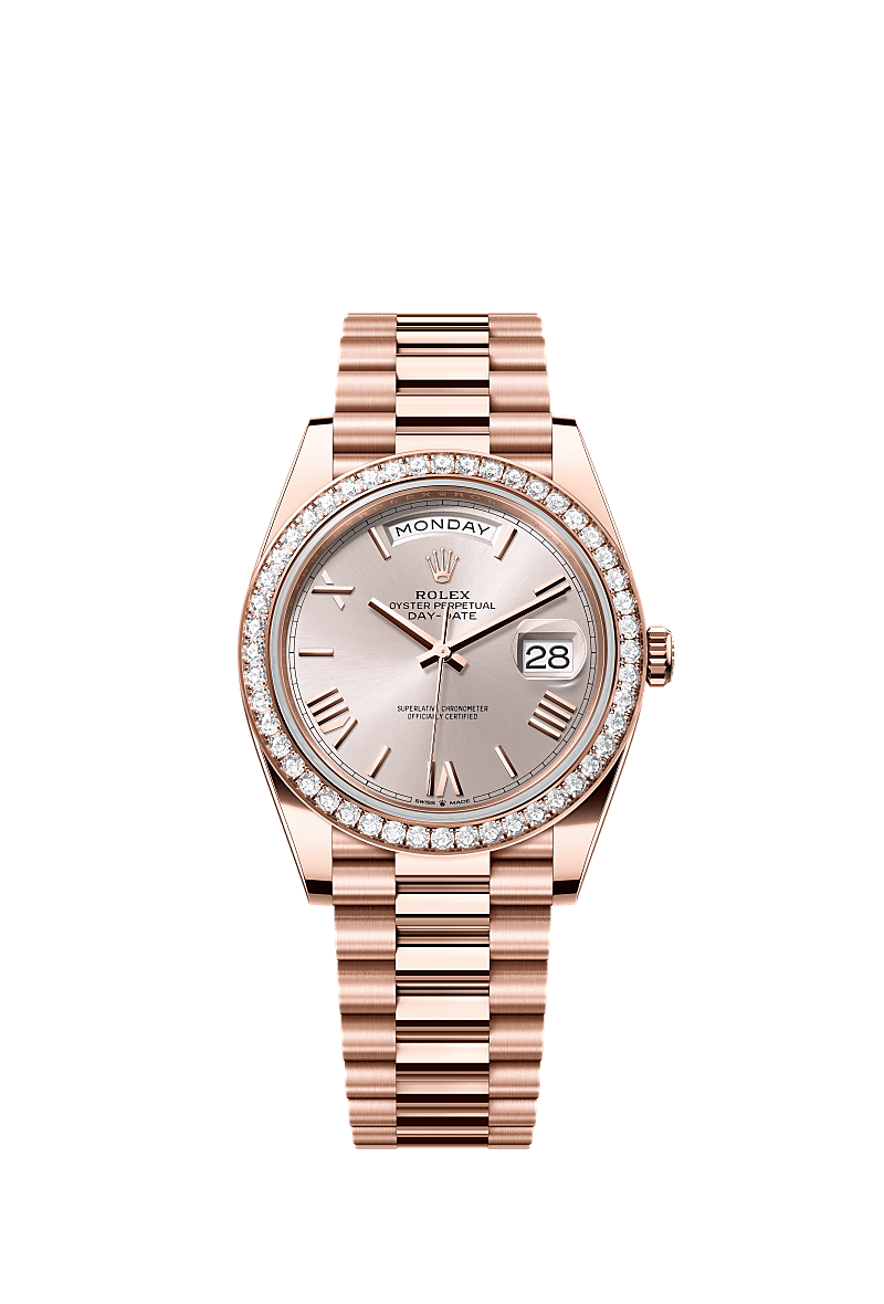 De Oyster Perpetual Day-Date 40 van 18 kt Everose-goud met een gezonnestraalde wijzerplaat, een met diamanten bezette bezel en een President-band.