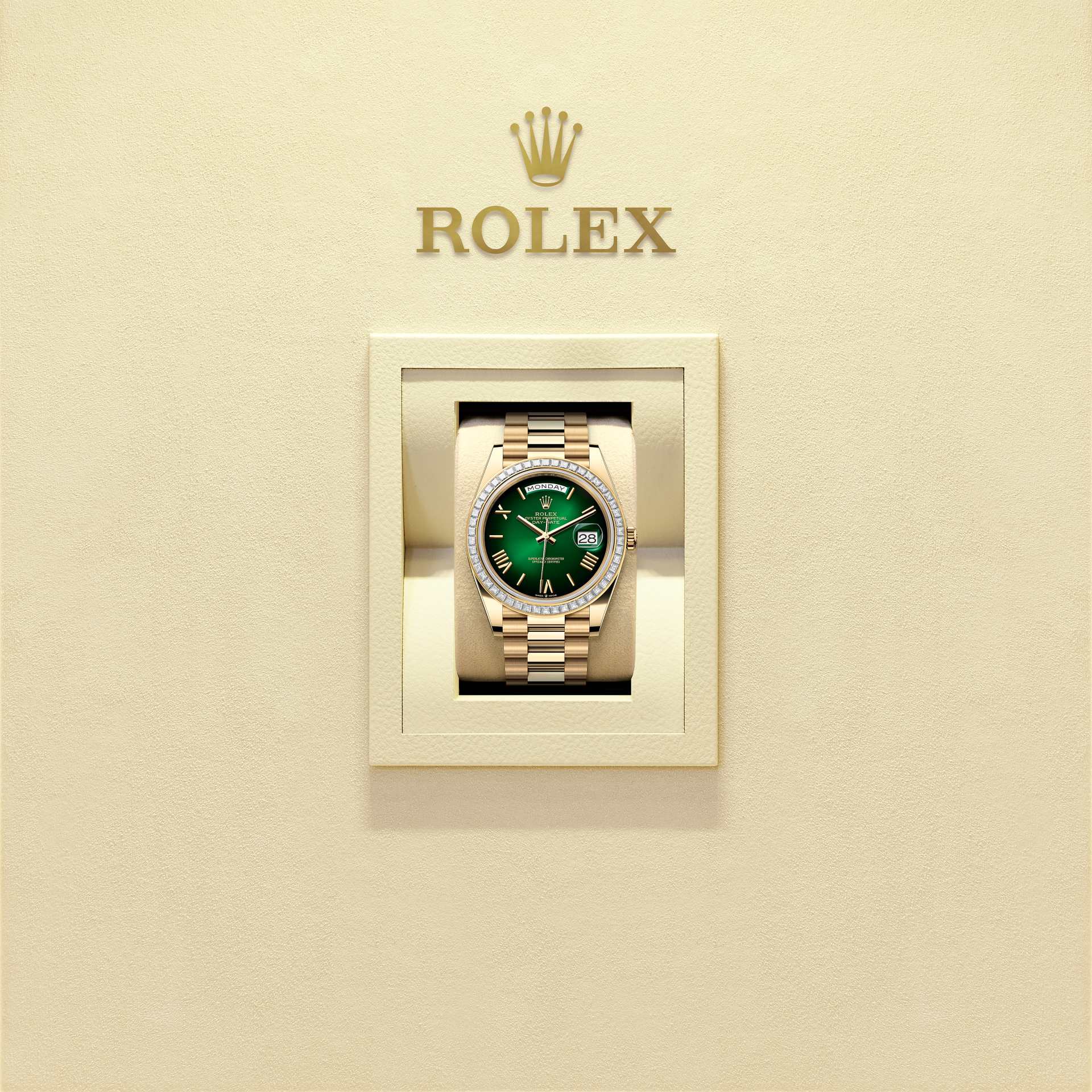 De Oyster Perpetual Day-Date 40 van 18 kt geelgoud met een schaduwgroene wijzerplaat, een met diamanten bezette bezel en een President-band.