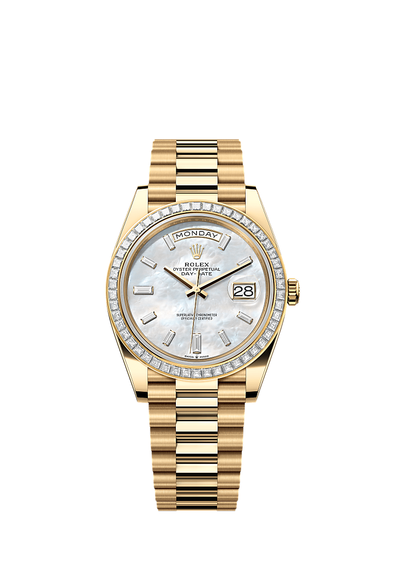 De Oyster Perpetual Day-Date 40 van 18 kt geelgoud, met een wit parelmoeren, met diamanten bezette wijzerplaat, een met diamanten bezette bezel en een President-band.