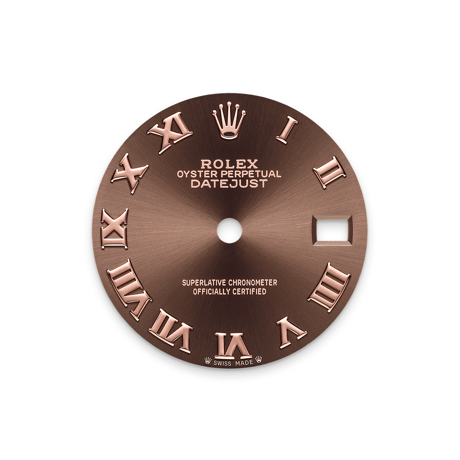 Deze Oyster Perpetual Lady-Datejust van 18 kt Everose-goud heeft een chocoladebruine wijzerplaat en een President-band.