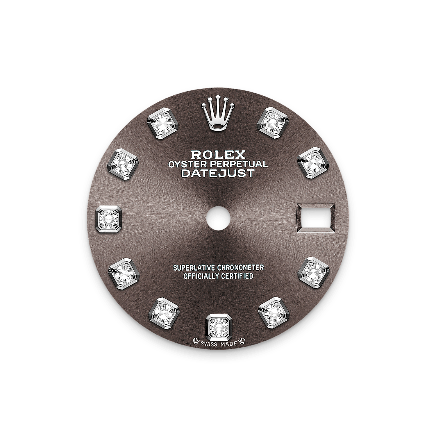 Deze wijzerplaat heeft diamanten in 18 kt gouden zettingen. Het sunray-motief zorgt voor subtiele lichtreflecties op veel wijzerplaten in de Oyster Perpetual-collectie. Het wordt verkregen door middel van meesterlijke borsteltechnieken, waarbij groeven worden gekerfd die vanaf het midden van de wijzerplaat naar buiten toe lopen.