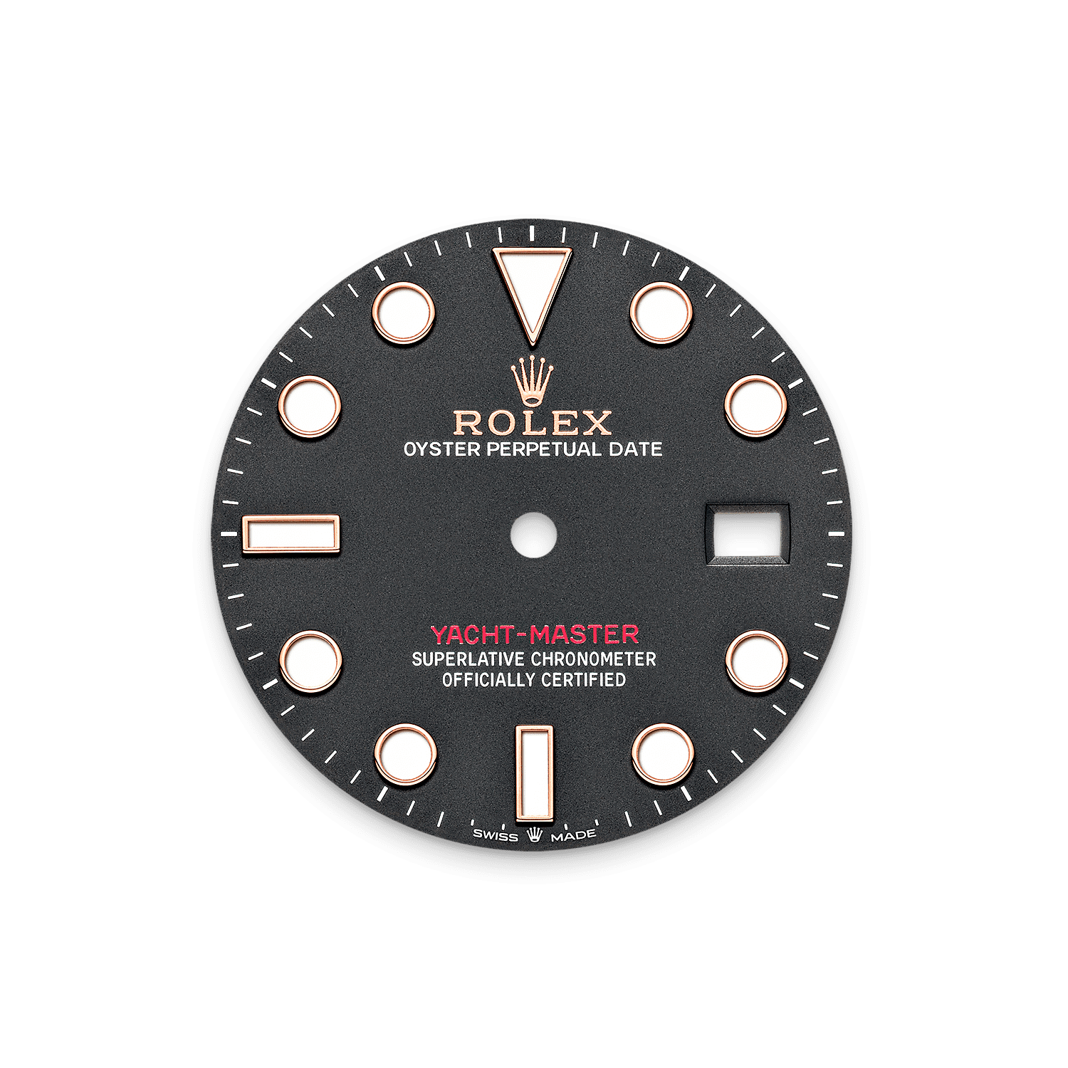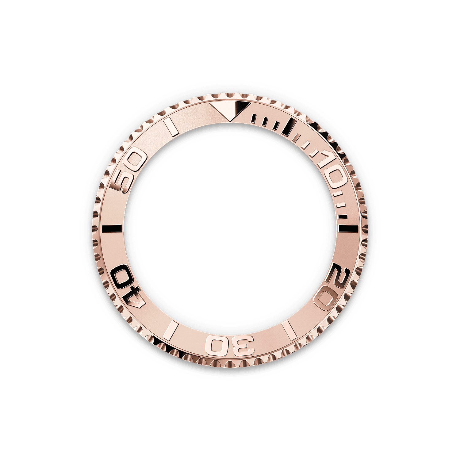 De Yacht‑Masters bidirectioneel draaibare bezel met 60-minutenverdeling is volledig gemaakt van edelmetaal (Everose-goud of platina) of voorzien van een Cerachrom-ring van hightechkeramiek, afhankelijk van het model. De verhoogde, gepolijste cijfers en schaalverdelingen vallen duidelijk op tegen de matte, gezandstraalde achtergrond.